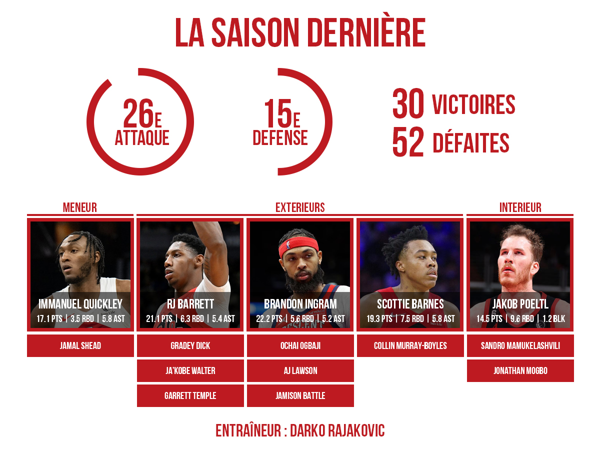 L’apport de Brandon Ingram reste conditionné à sa disponibilité, pas une assurance tous risques depuis le début de sa carrière. Et il est loin d’être le seul : Scottie Barnes a loupé successivement 22 et 17 rencontres ces deux dernières saisons, RJ Barrett en a joué 58 lors des deux derniers exercices et même Immanuel Quickley a été touché.