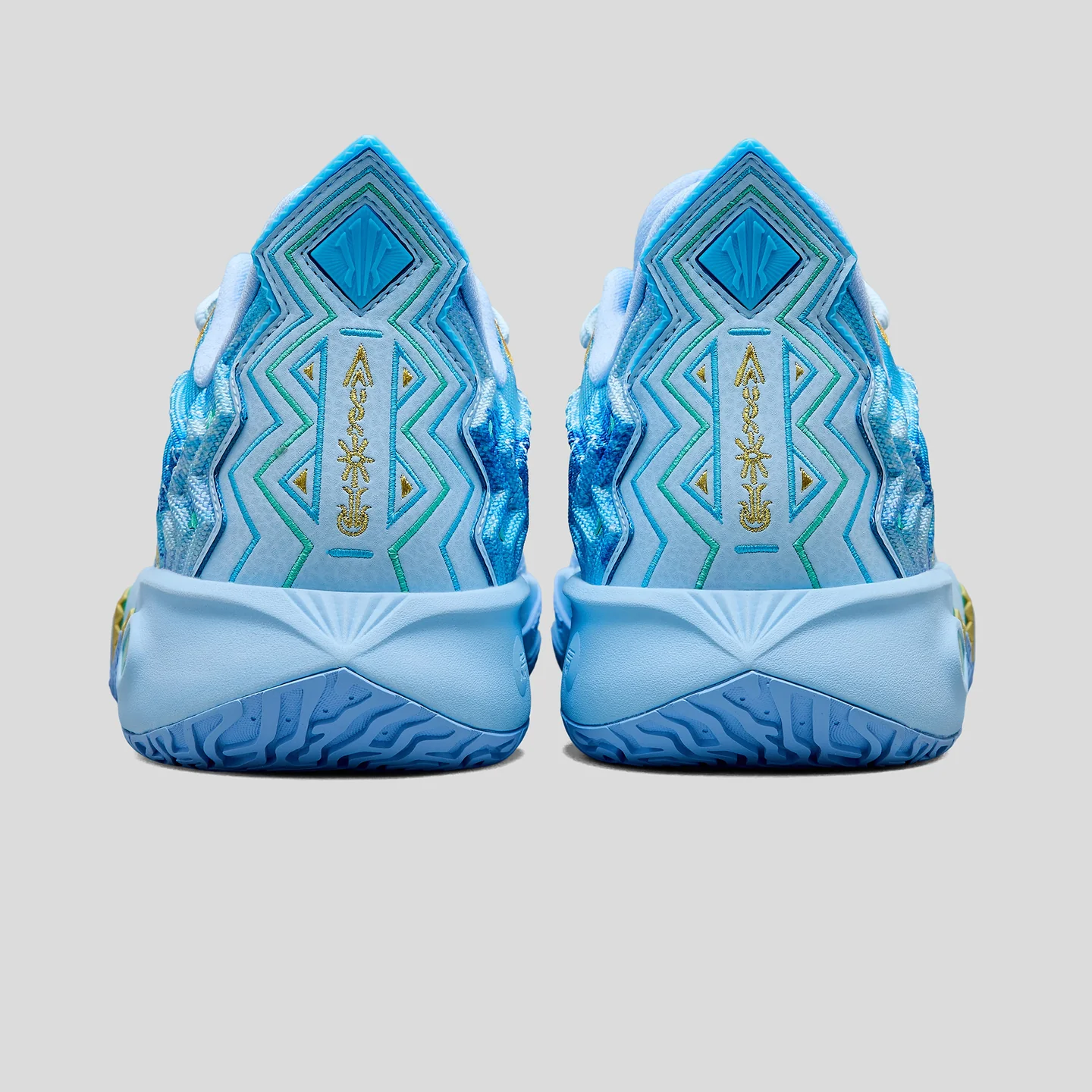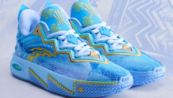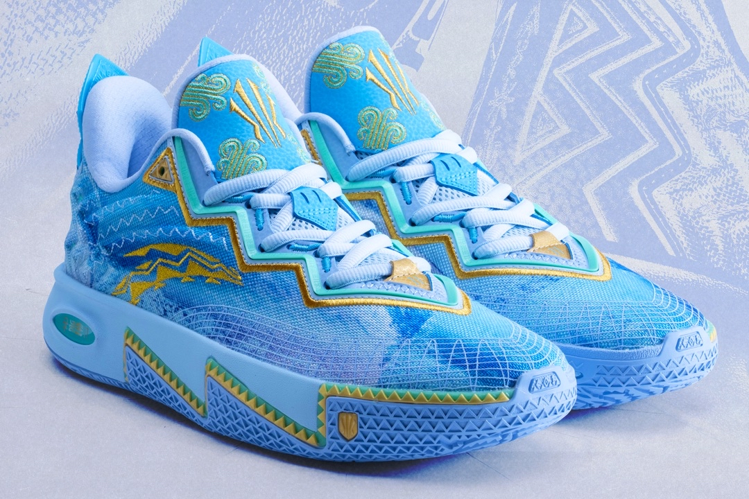 Le coloris ne passera pas inaperçu avec sa tige ornée de différentes teintes de bleu avec des finitions en doré et vert, pour faire ressortir les motifs renvoyant à l’héritage amérindien de Kyrie Irving.