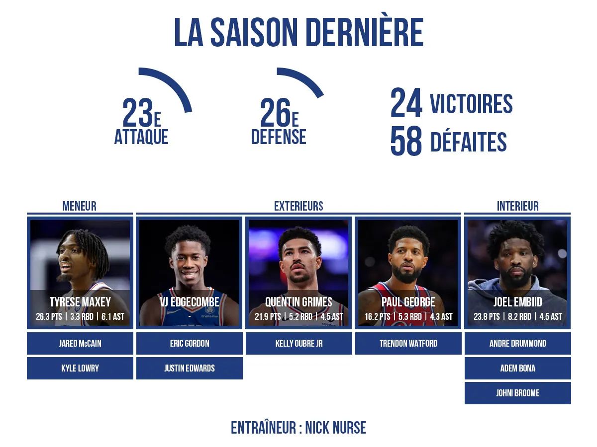 Ce scénario idéal contient de très nombreux éléments au conditionnel. La forme de Joel Embiid et de Paul George, donc, le cœur du problème de la saison passée. Imaginons que les deux vétérans soient en mesure de jouer en étant globalement libérés de leurs ennuis physiques. Nick Nurse devra ensuite trouver la bonne carburation pour associer le dragster Tyrese Maxey avec le couteau-suisse Paul George et le jeu de Joel Embiid entre puissance et technique. Sur le papier, les ingrédients sont réunis pour que tout le monde puisse y trouver son compte, y compris les autres joueurs sur le parquet tant les espaces seraient ouverts.