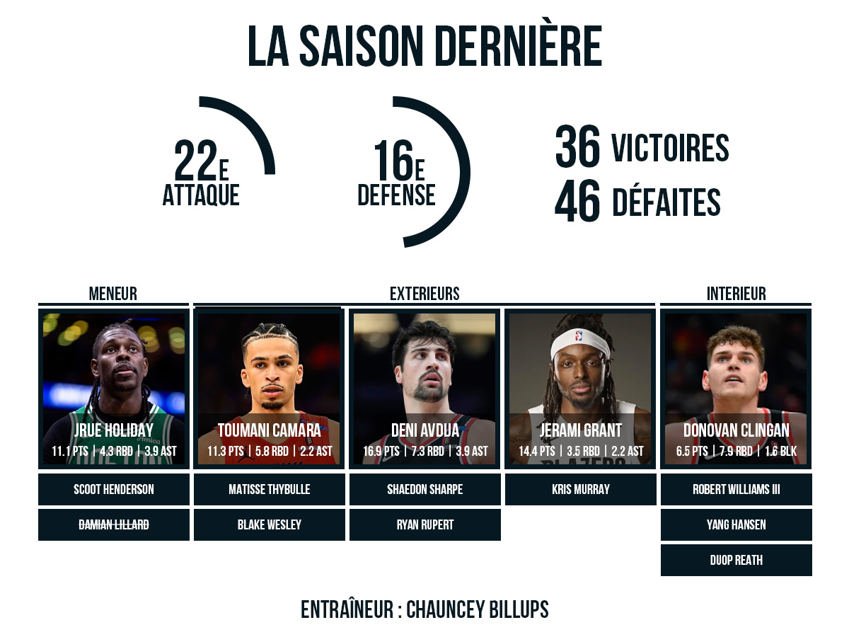 Arrivées : Yang Hansen (draft), Jrue Holiday, Damian Lillard, Caleb Love (two-way), Blake Wesley