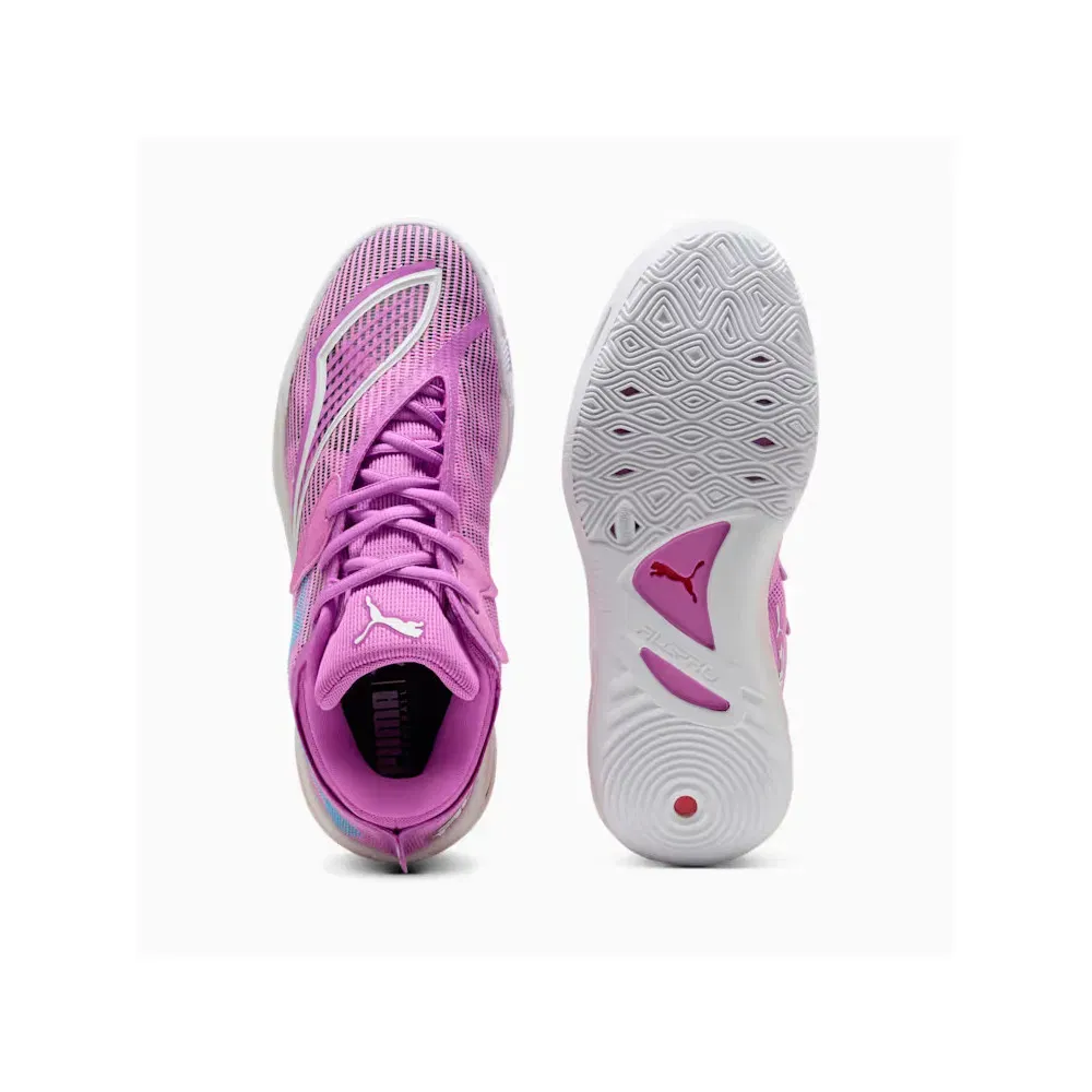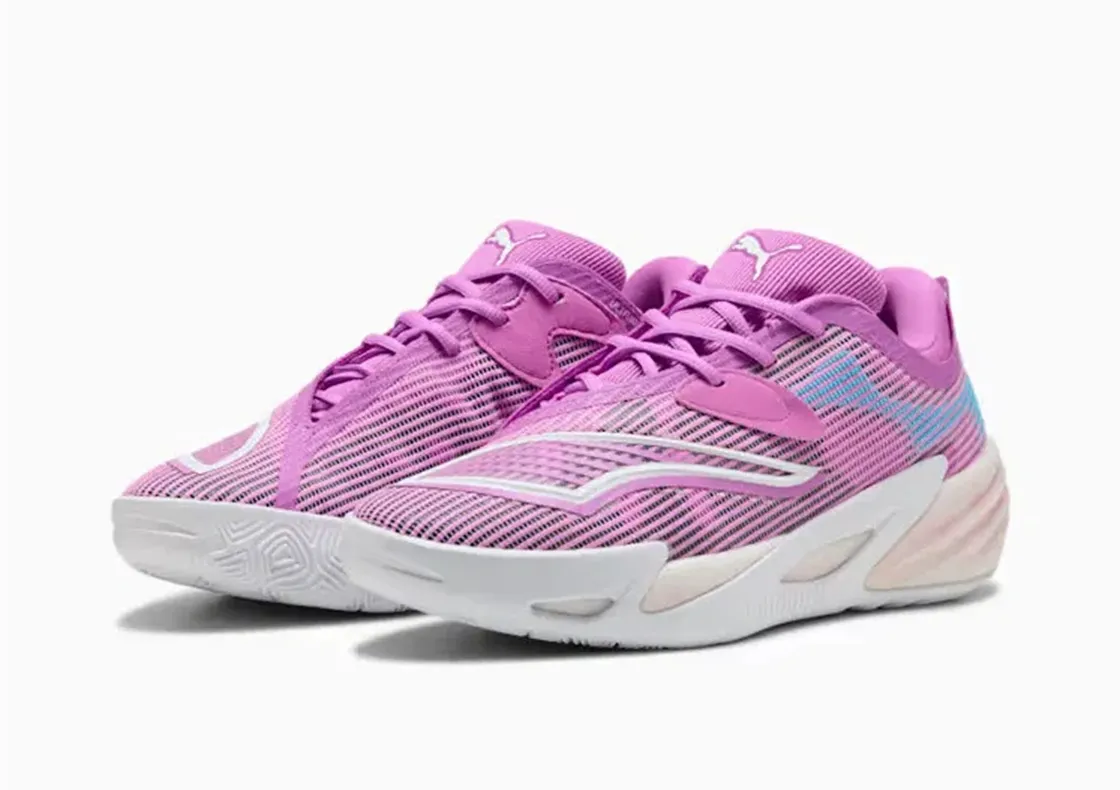 Sa tige se distingue par ses deux touches de violet et de fines touches de rose, qu’on retrouve sur la semelle, principalement blanche. Les logos Puma présents sur le talon et la languette ressortent en blanc, comme l’inscription « All Pro ».
