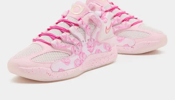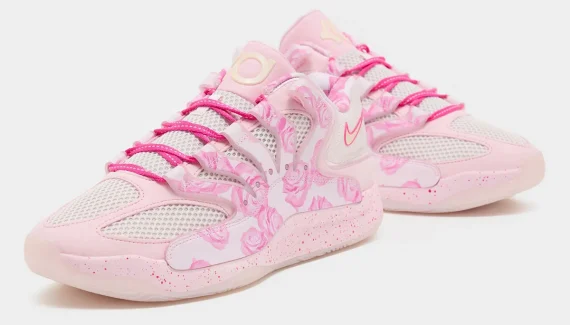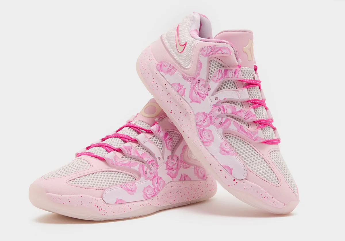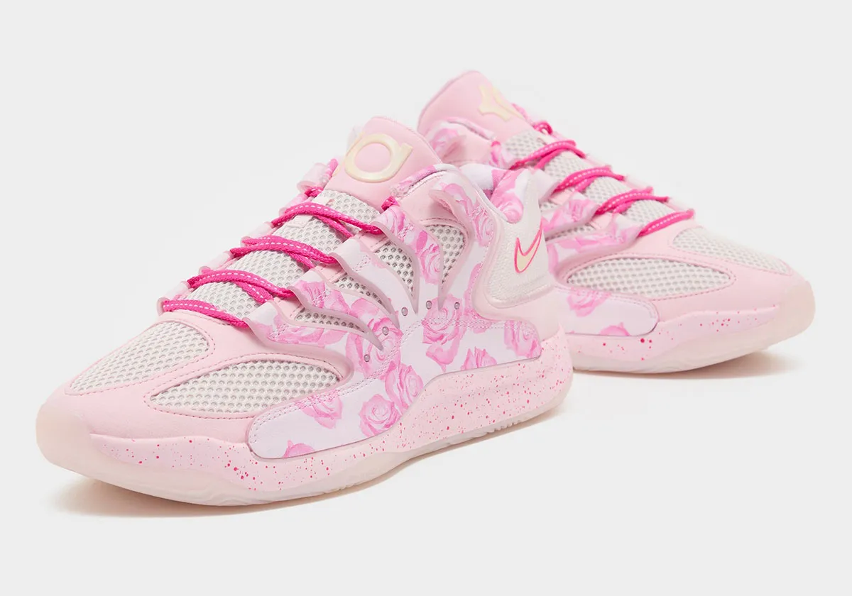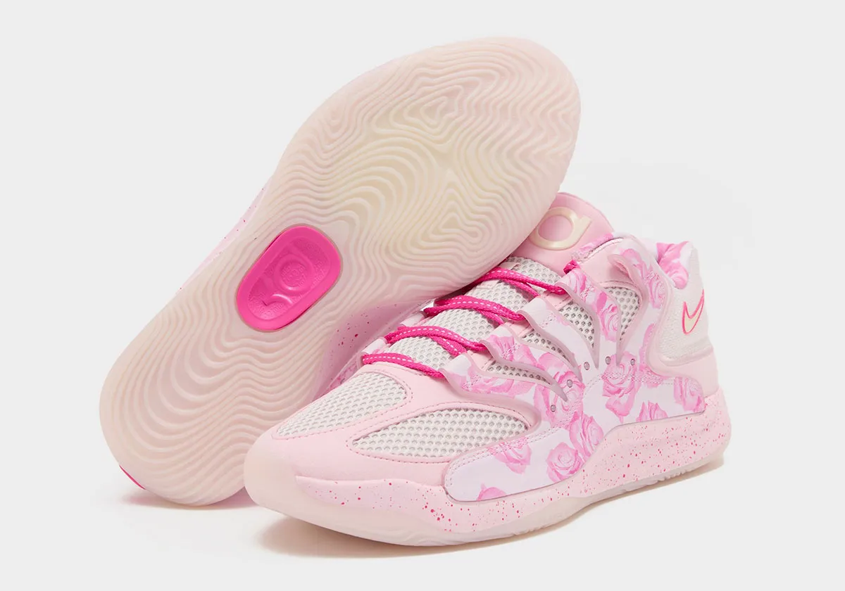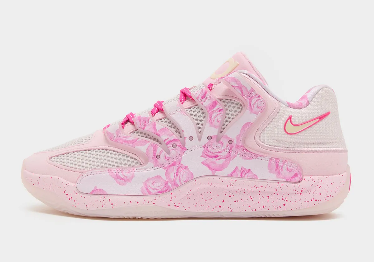 Les premières images du coloris « Aunt Pearl » de la 18e chaussure signature de Kevin Durant présentent une tige en rose et blanc assortie de motifs floraux . L’ensemble repose sur une semelle intermédiaire rose tachetée et une semelle extérieure blanche translucide.