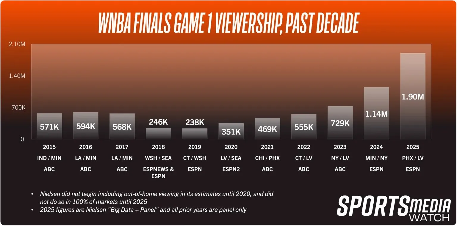 En attendant la publication des chiffres du Game 2, on sait déjà que le Game 1 de ces WNBA Finals 2025 restera dans l’histoire comme le Game 1 des Finals le plus regardé depuis la création de la ligue.