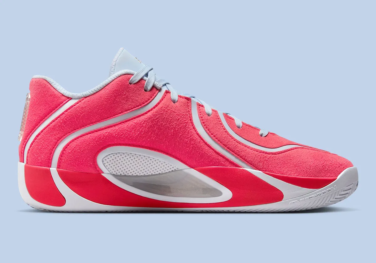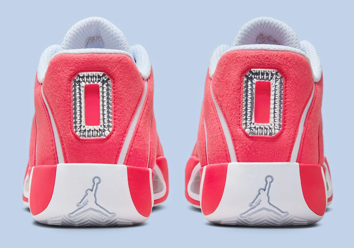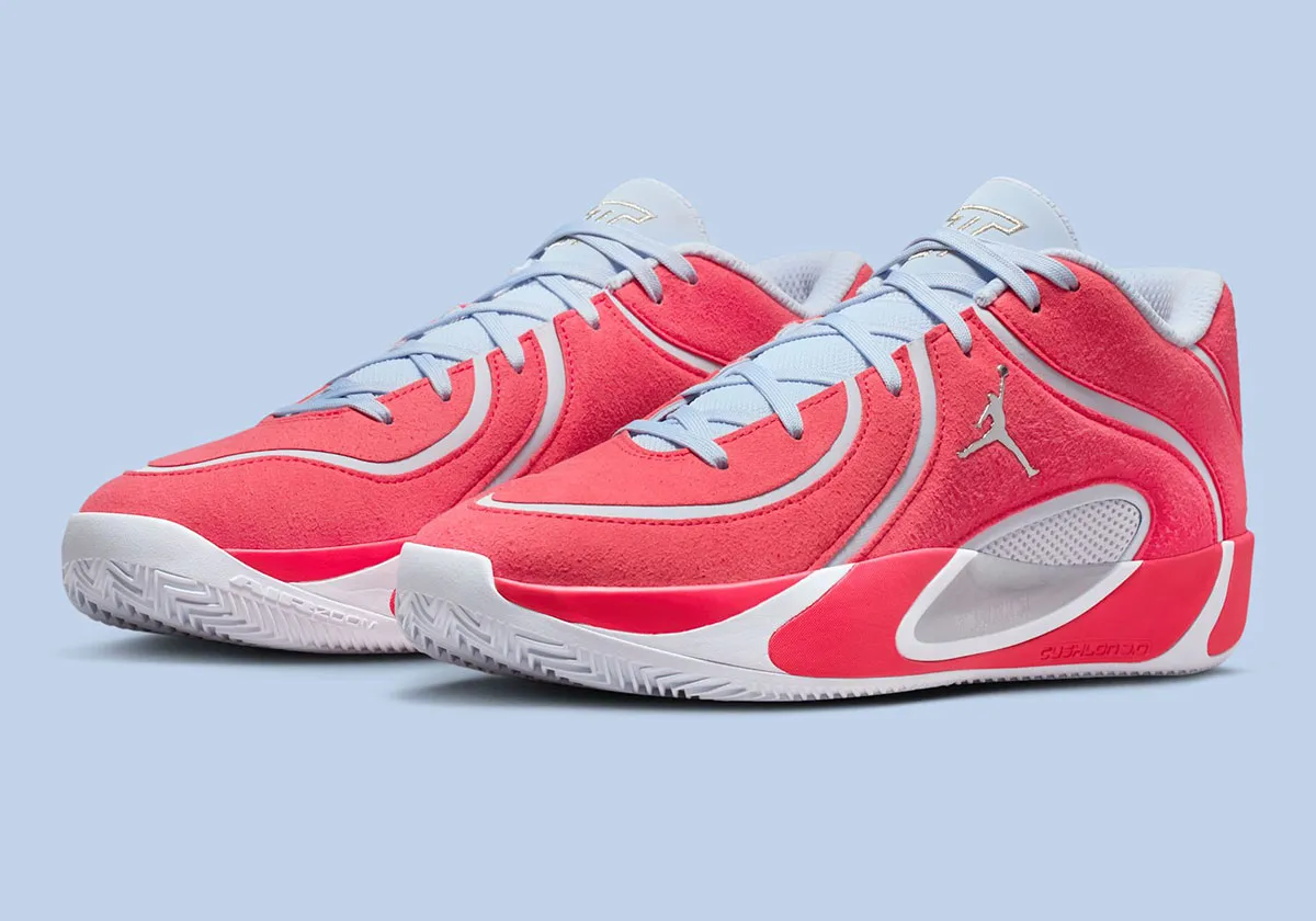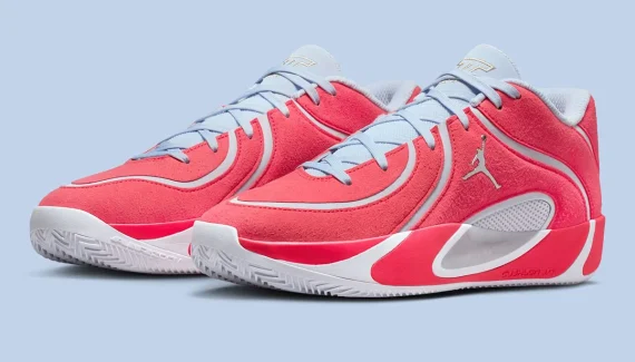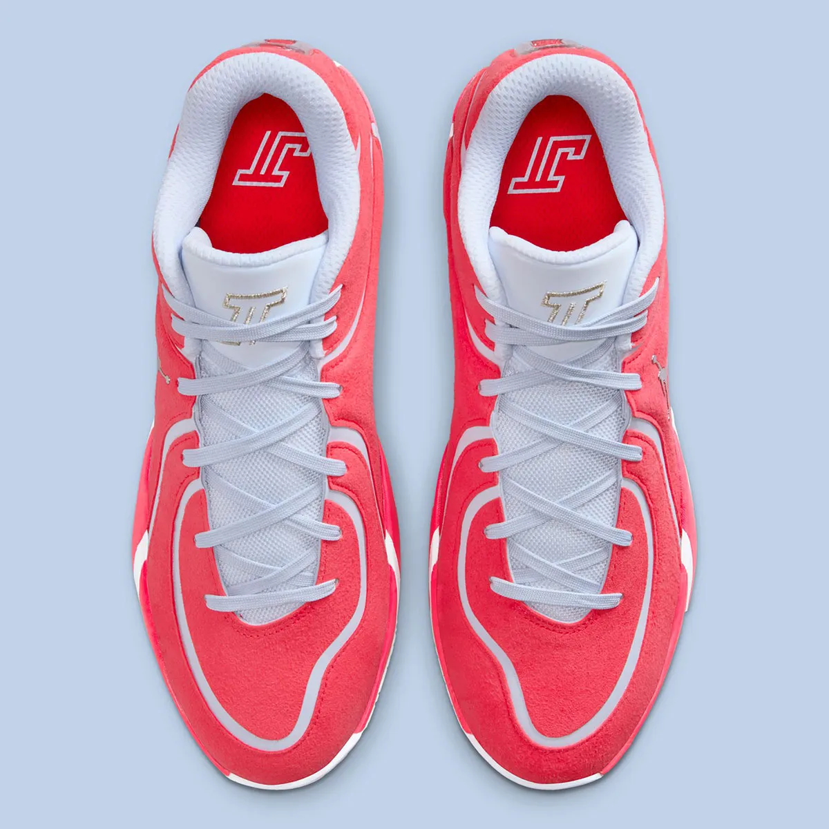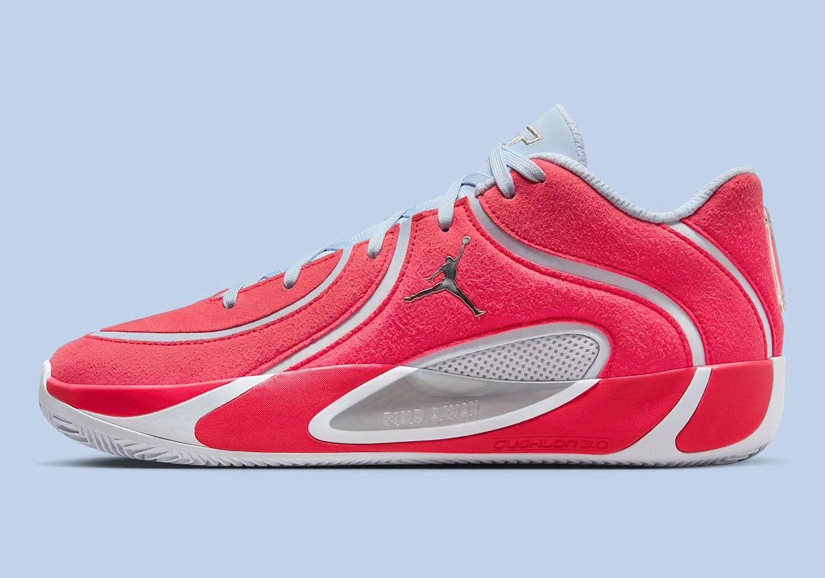 La Jordan Tatum 4 a été conçue dans le même moule que les précédentes, que ce soit au niveau de la tige, plus épurée, du talon, où l’on retrouve le numéro zéro du joueur, ainsi que de la semelle, équipée d’une mousse en Cushlon 3.0 et d’un amorti “Zoom Air” sous l’avant du pied. Ce premier coloris baptisé “St. Louis” rend hommage à la ville de naissance de Jayson Tatum. La tige en daim rouge est complétée de finitions en blanc, tandis que le “JT” figurant sur la languette ressort en doré, et le “Jumpman” sur l’empeigne apparaît en gris.