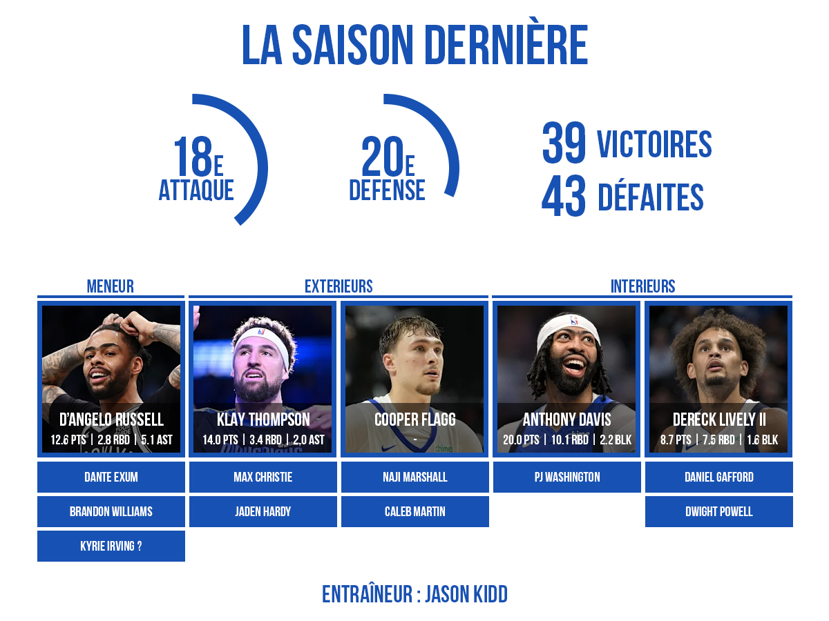 Avec Klay Thompson pour écarter le jeu, Dereck Lively II pour protéger le cercle et des « role players » très sérieux en sortie de banc (P.J. Washington, Naji Marshall, Daniel Gafford…), l’entraîneur Jason Kidd peut s’appuyer sur un groupe calibré pour les playoffs. Et cela, même avec D’Angelo Russell comme meneur intérimaire le temps de la convalescence de Kyrie Irving.