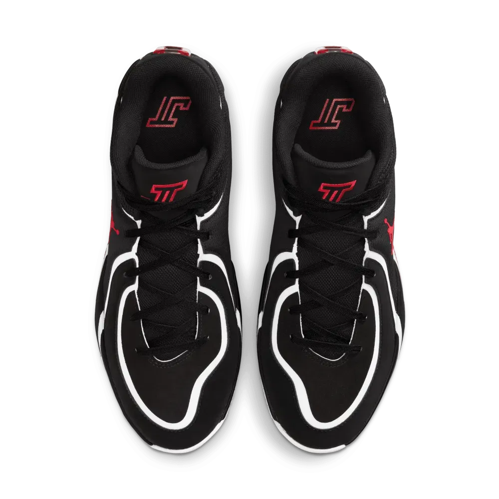 Le premier coloris « St. Louis » est officiellement sorti vendredi dernier en France. On connaît déjà le deuxième, et ce sera cette version « Bloodline », en noir, rouge et blanc, avec une tige en noir assortie de bandes blanches et de finitions en rouge, pour faire ressortir le « Jumpman » et le logo « JT » du joueur des Celtics sur la languette. Son numéro zéro apparaît également en rouge sur le talon.