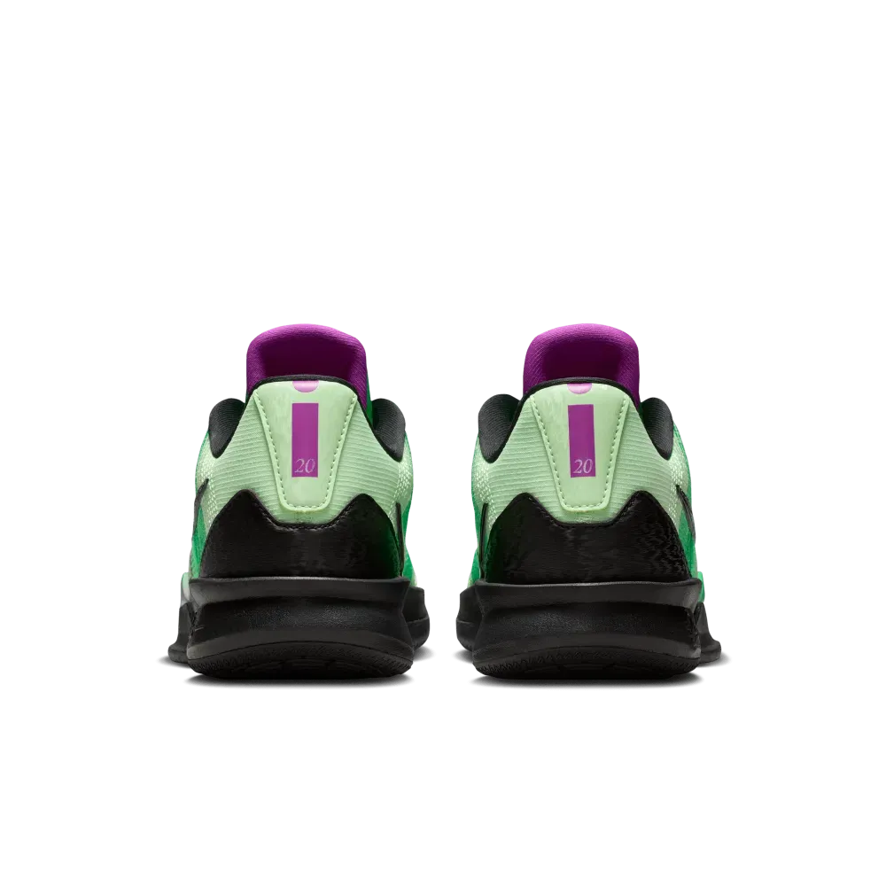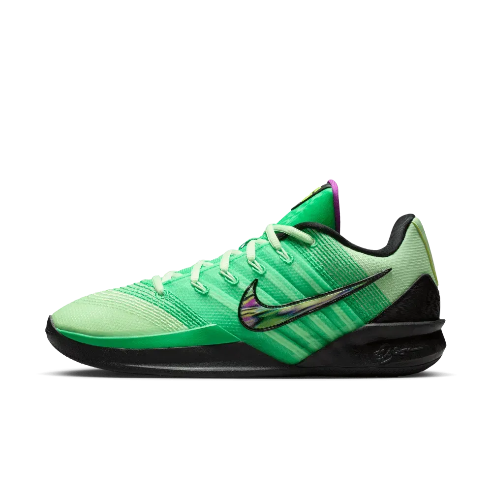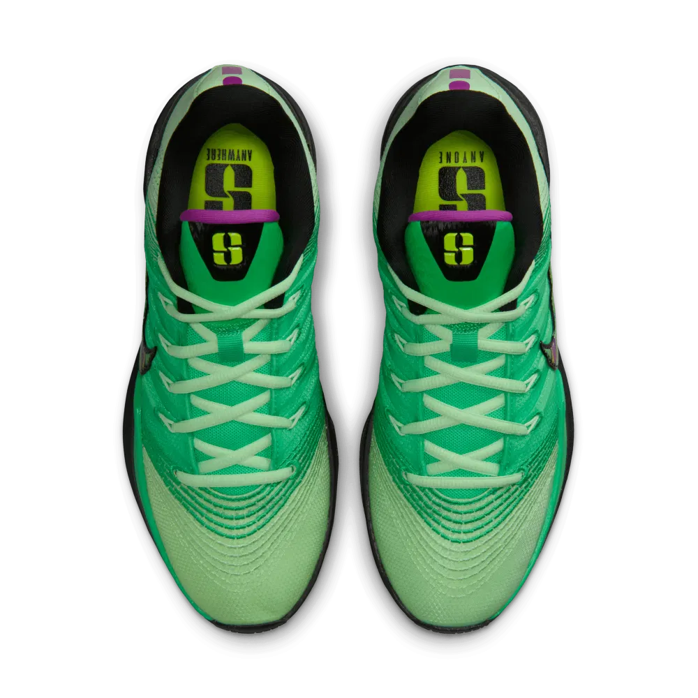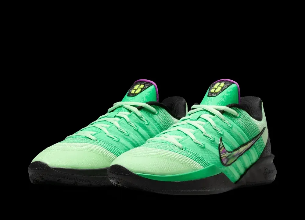 La tige opte pour différents tons de vert, ainsi qu’un « Swoosh » latéral aux contours noir. On peut noter du violet sur les finitions ainsi qu’une touche de vert « Volt » pour faire ressortir le logo « S » de Sabrina Ionescu sur la languette. La semelle en noir et vert reste équipée d’une unité Zoom Air à l’avant du pied et une mousse Cushlon en complément intermédiaire.