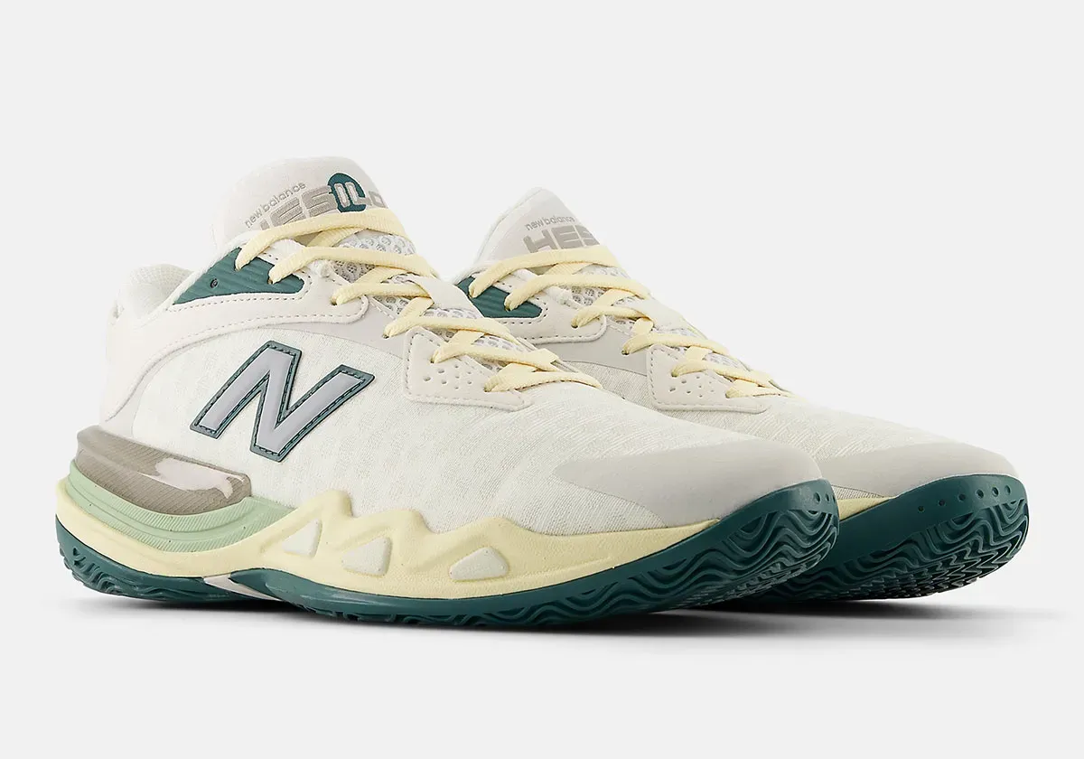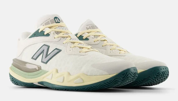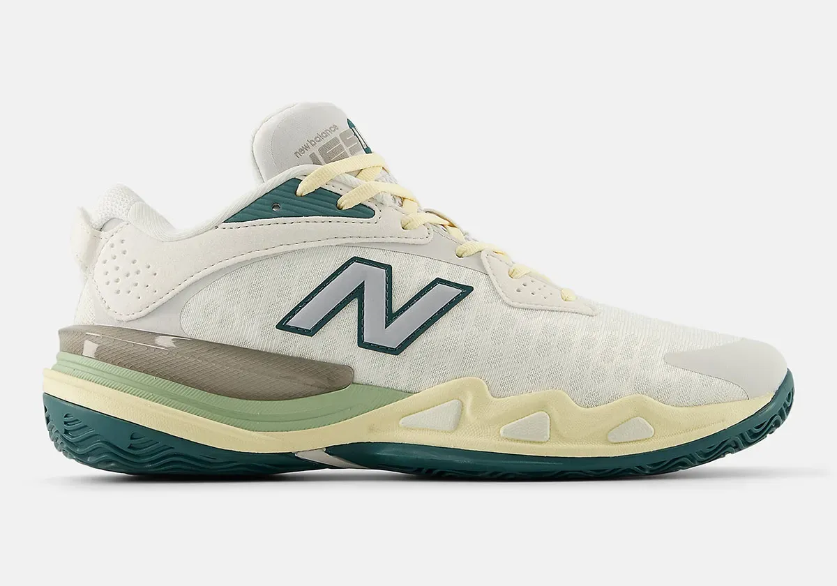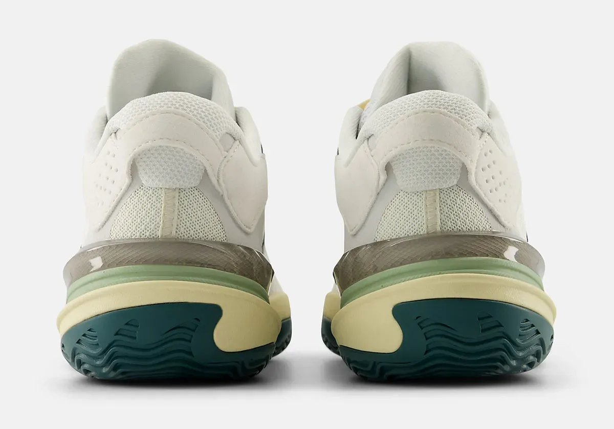 Sa tige en blanc cassé et gris est assortie de touches de vert rappelant les couleurs principale de l’état du Maine, dont Cooper Flagg est originaire. Le « N » de New Balance apparaît ainsi en gris aux contours vert.