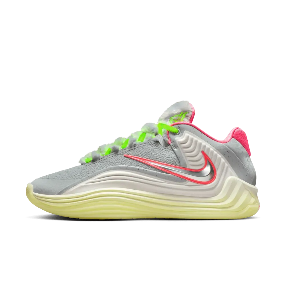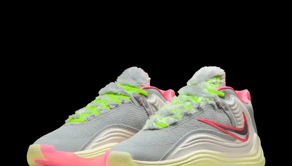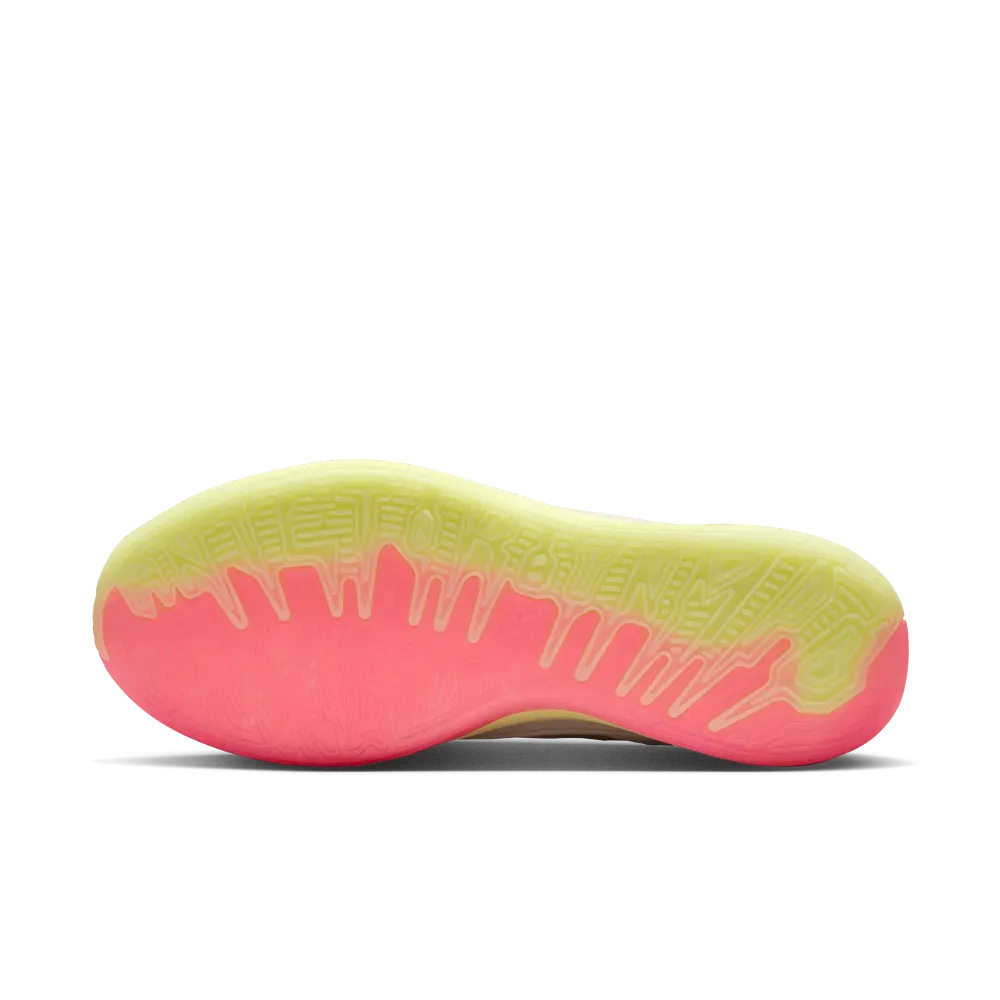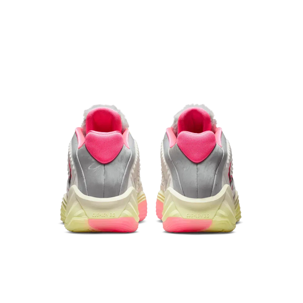 La dernière touche d'originalité se situe au niveau de la languette touffue en gris. Entre rose et jaune-vert, la semelle extérieure fait notamment ressortir les lettres du nom de famille de Giannis Antetokounmpo.