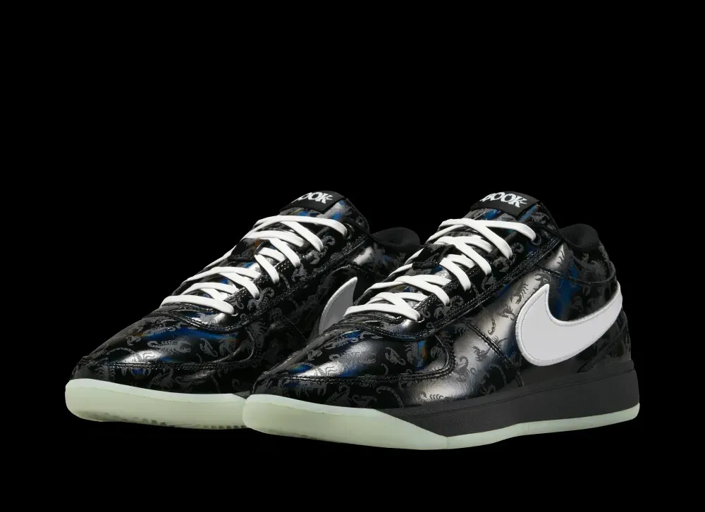 La tige de la première chaussure signature de Devin Booker est en effet habillée d'un cuir brillant, recouvert d'un imprimé scorpion qui fait référence à l'anniversaire du joueur, qui fêtera ses 29 ans le 30 octobre prochain. L'empeigne est recouverte d'un « Swoosh » blanc, de la même couleur que la semelle extérieure. A noter que cette Book 1 ne dispose pas de tirette, comme sur les premiers modèles.