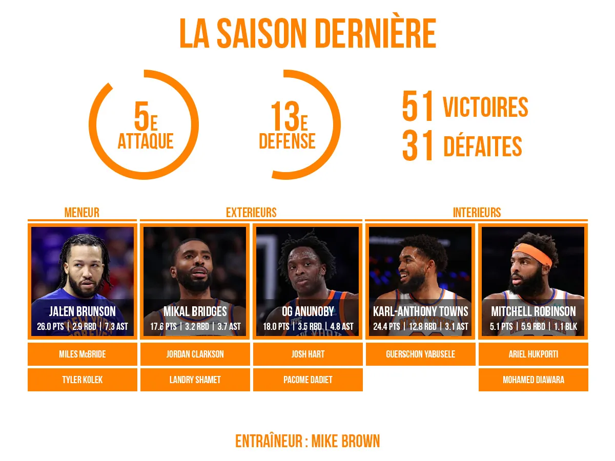 Le socle de l’effectif demeure inchangé, avec Mikal Bridges et O.G. Anunoby sur les ailes, le couteau-suisse Josh Hart et les précieux « role players » Mitchell Robinson et Miles McBride.