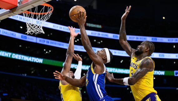 Le « pick-and-roll » entre Stephen Curry et Jimmy Butler a tellement désorganisé la défense des Lakers que l’ailier s’est retrouvé avec un boulevard pour attaquer le cercle. Le joueur des Warriors n’a pas été en mesure de conclure, mais il a obtenu la faute adverse et un énième passage sur la ligne des lancers-francs.
