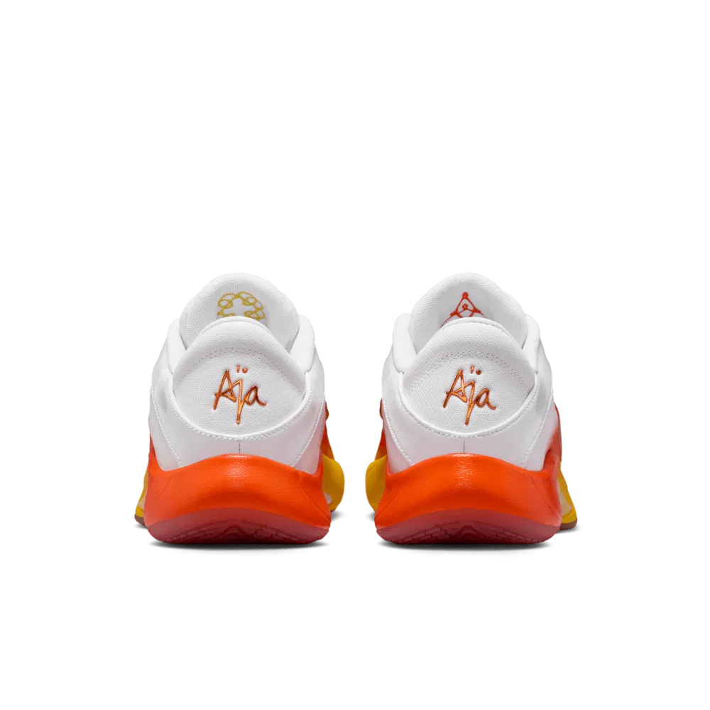 La tige se présente avec une base en jaune et orange accompagnée de blanc. Le « Swoosh » ressort en orange brillant. La signature d’Aja Wilson sur le talon et son logo sur la languette apparaissent également en orange. L’ensemble repose sur une semelle orange et jaune,