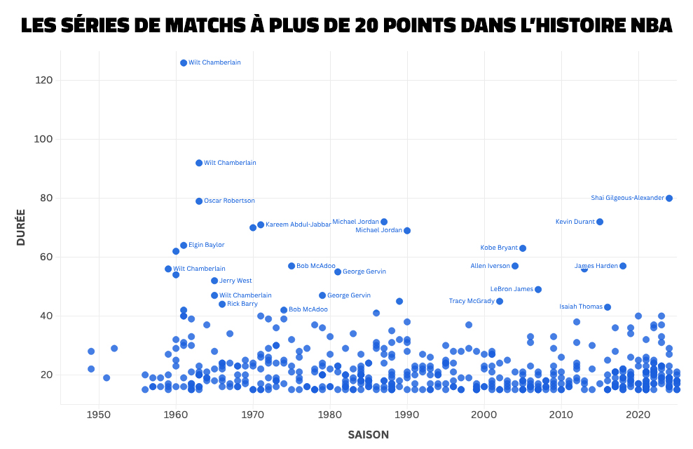La série actuelle de « SGA » a débuté le 1er novembre de la saison dernière. La dernière fois qu’il n’a pas atteint la barre des 20 points remonte au 30 octobre 2024, face aux Spurs, lorsqu’il s’était contenté de 18 points.