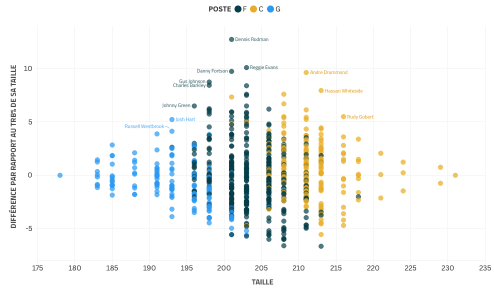 Statistiquement, son argument se défend puisque si on regarde la différence entre le TRB% (le pourcentage de rebonds qu’un joueur récupère lorsqu’il est sur le parquet) des joueurs par rapport au TRB% moyen pour leur taille, un seul « guard » fait mieux que la moyenne de sa taille, Josh Hart, et il ne joue pas vraiment meneur/arrière…