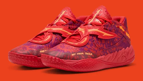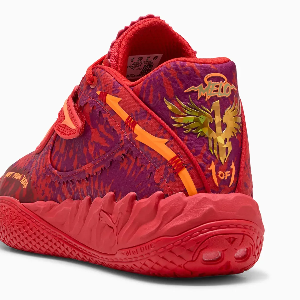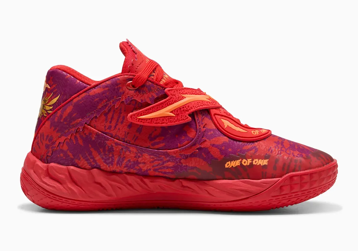 La tige emprunte cette fois des motifs « Tie-Dye » en violet pour accompagner une base rouge vif et des finitions en orange, comme sur le double-strap recouvrant les lacets. Sur le talon, le logo « Melo » en gris et orange surplombe le logo du phénix « 1 of 1 » aux différentes nuances de vert. L’ensemble repose sur une semelle rouge et orange.