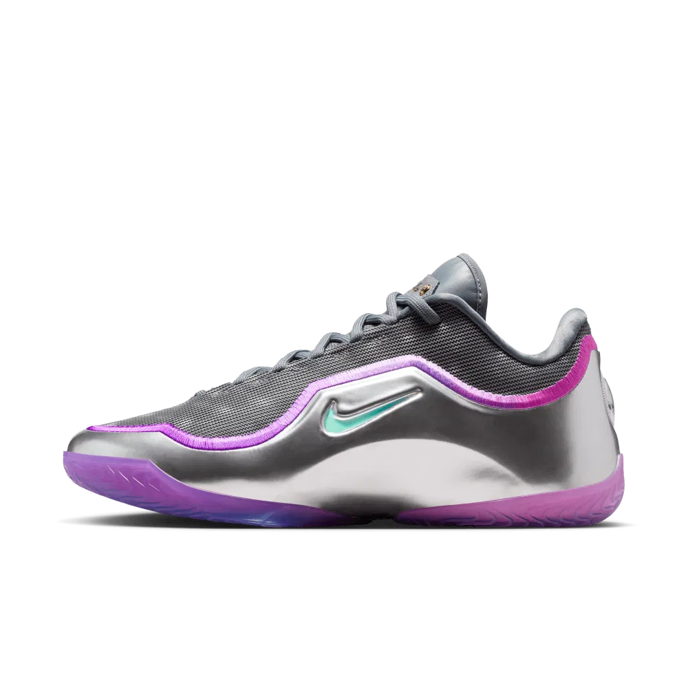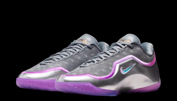 On a du mal à voir la référence à cet épisode unique de l’histoire de la ligue. Le coloris est néanmoins plutôt réussi, avec une tige mêlant gris et gris métal, ornée d’une bande en violet pour faire notamment ressortir les contours de la couronne dessinée sur l’empeigne. Le “Swoosh” latérale apparaît en bleu ciel tandis que le logo de couronne de l’autre côté ressort couleur or. La signature apparaît en doré sur la languette, et l’ensemble repose sur une semelle extérieure également violette.