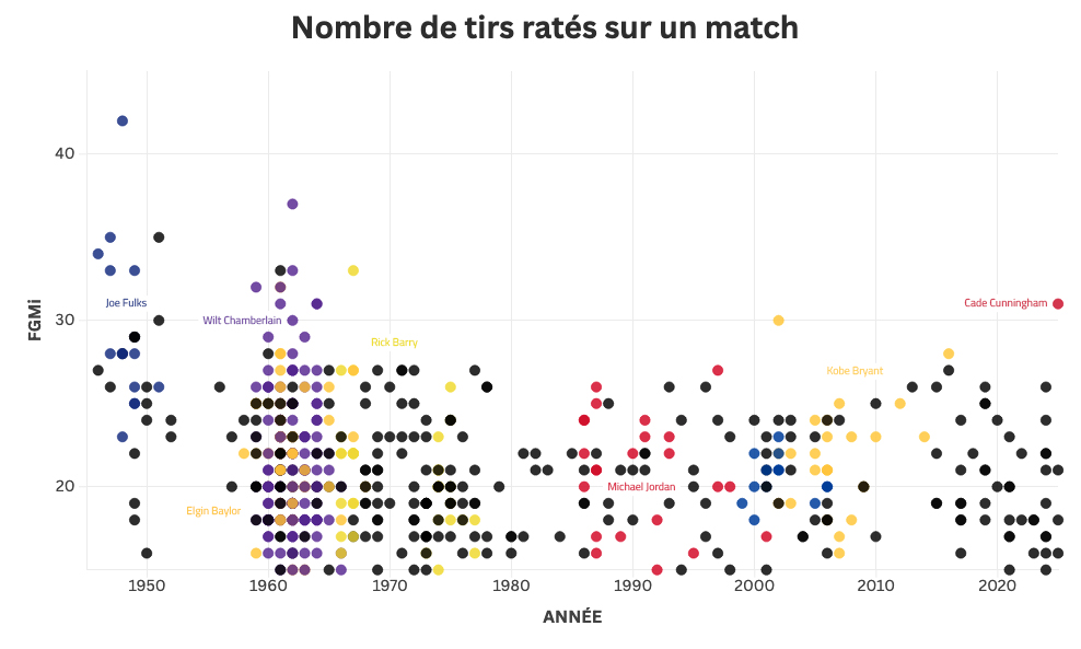 Le leader des Pistons a en effet pris pas moins de 45 shoots dans cette rencontre, qui s’est terminée en prolongation. Et comme il a seulement trouvé la cible à 14 reprises, ses 31 ratés sont un record depuis plus de 50 ans. Il faut remonter à Rick Barry en 1967 (17/50 au shoot) pour trouver trace d’un tel total de tirs manqués dans une partie par un seul joueur.