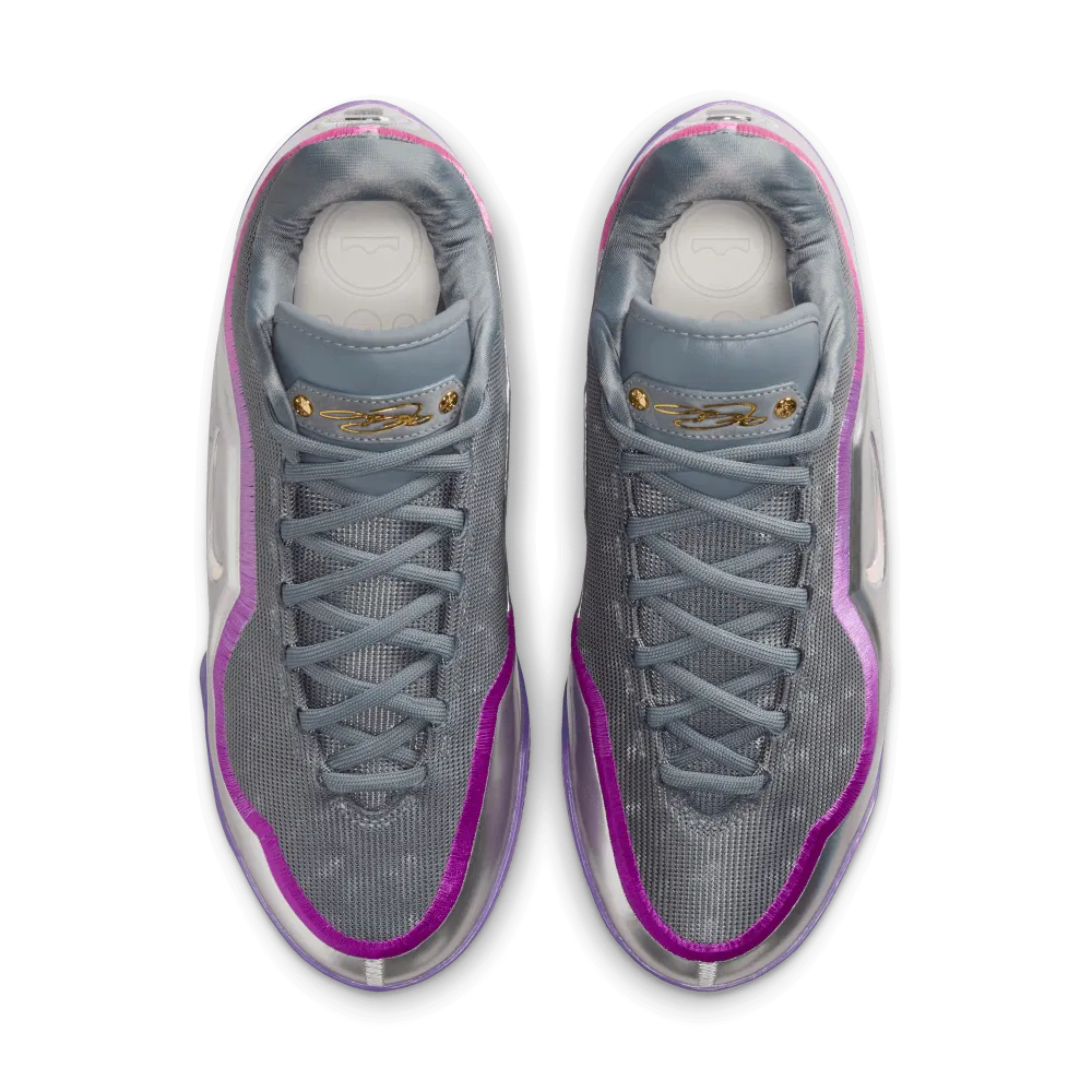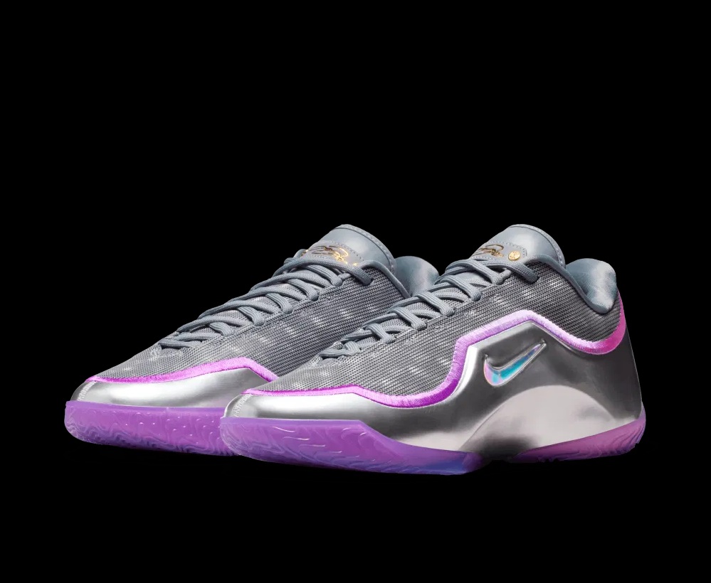 Le « Swoosh » latérale apparaît en bleu ciel tandis que le logo de couronne de l’autre côté ressort couleur or. La signature apparaît en doré sur la languette, et l’ensemble repose sur une semelle extérieure également violette.