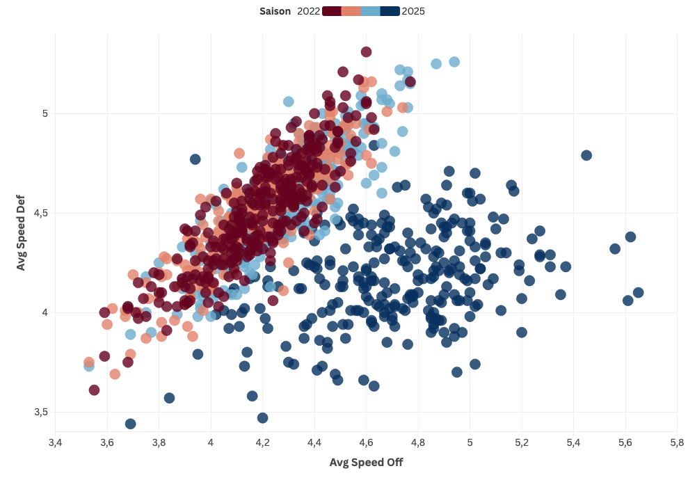 Si on représente la vitesse moyenne des joueurs en attaque et en défense, on voit qu’il y a une très nette hausse cette saison, et ce n’est pas un simple effet du début de saison, car si on prend les données au même moment de la saison, en 2022/23, 2023/24, 2024/25 et 2025/26, l’explosion reste extrêmement claire.