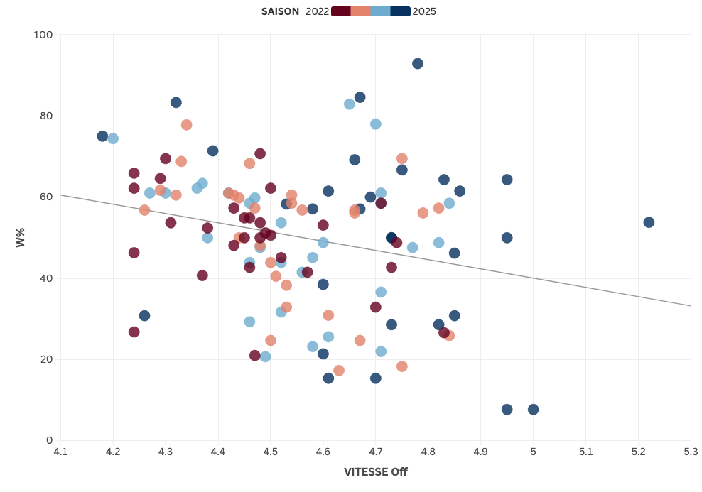Vitesse offensive moyenne des équipes NBA (Vitesse Off) par rapport à leur pourcentage de victoires (W%) lors des saisons 2022/23, 2023/24, 2024/25 et 2025/26