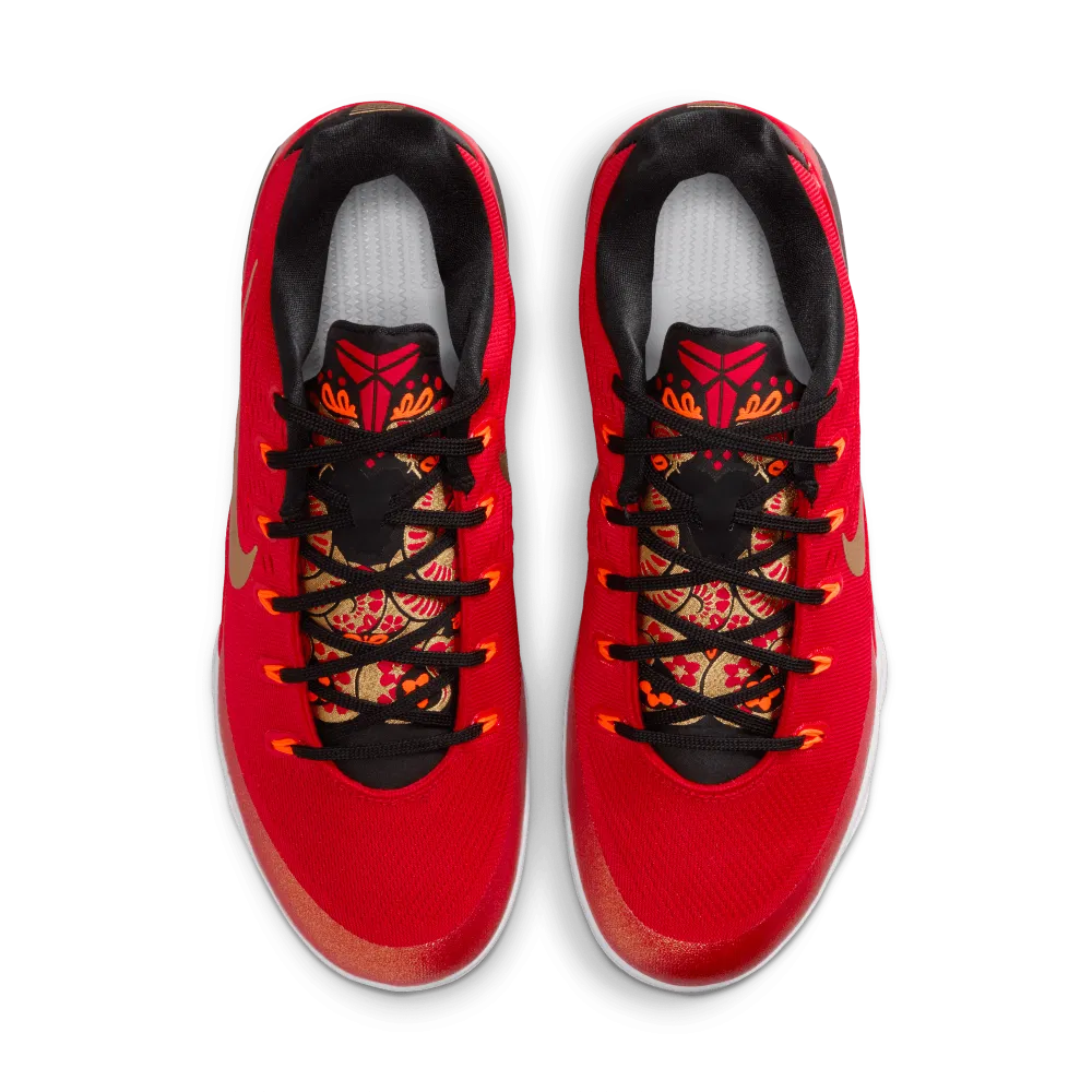 On retrouve les mêmes codes, avec une tige en rouge contrastée par des finitions en or et noir, pour faire ressortir le « Swoosh » sur l’empeigne ou la signature du joueur sur le talon. Les motifs présents sur la languette renvoient quant à eux à la culture chinoise et au nouvel an chinois, accompagnés d’un « Kobe stealth » en rouge.