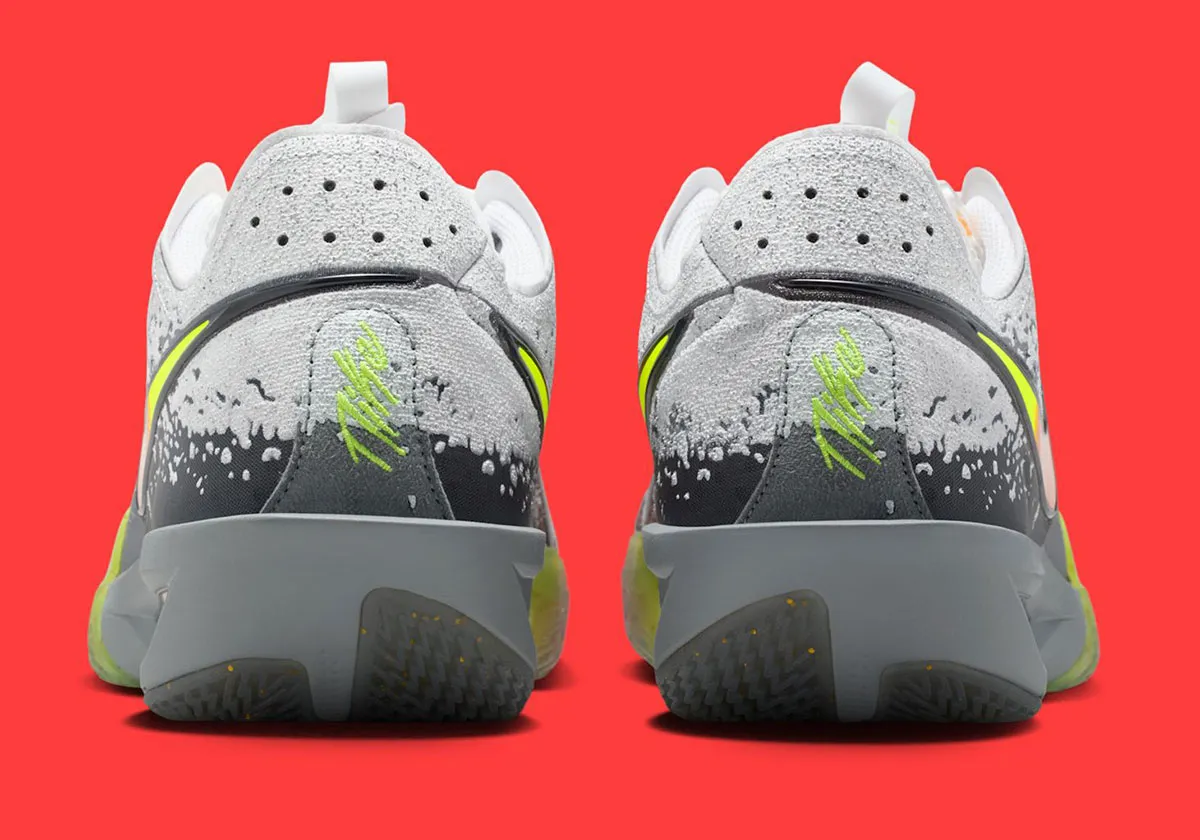 Une version bien singulière avec une tige basique en gris saupoudrée d’une couche effet neige sur la partie supérieure. L’ensemble est agrémenté de finitions qui fleurent bon les sports d’hiver avec ce dégradé entre orange et jaune fluo pour faire ressortir un « Swoosh » aux contours en noir sur l’empeigne et pour habiller la partie avant de la semelle extérieure.