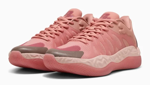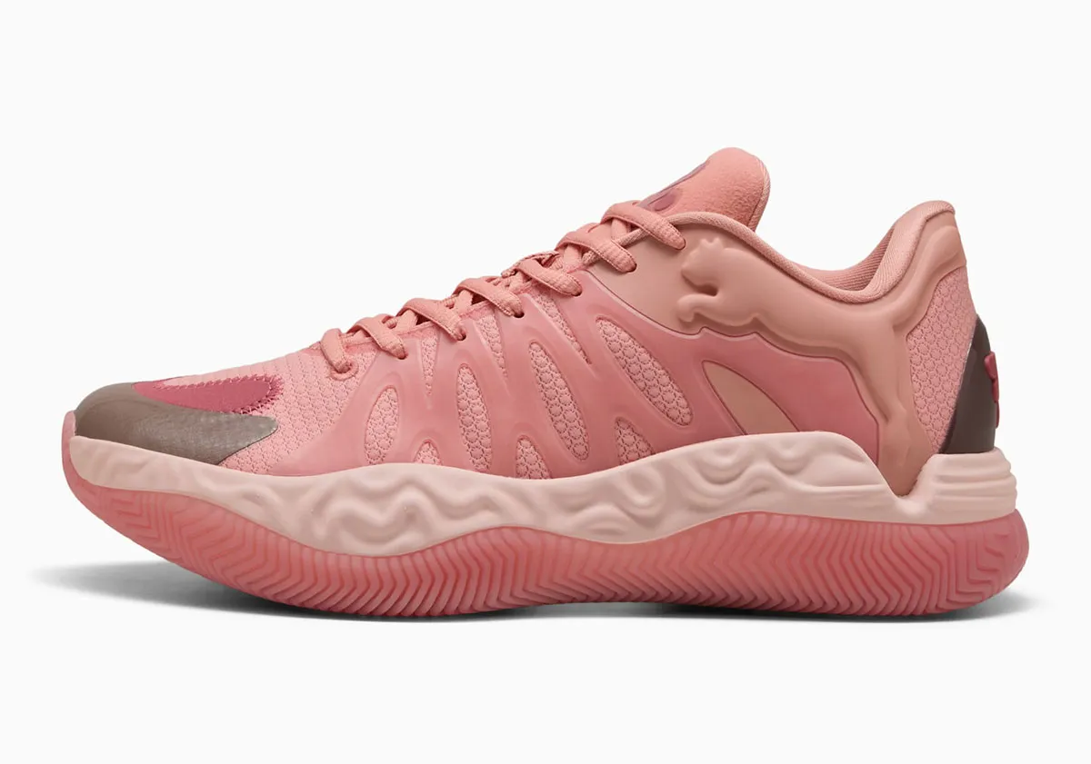Les fruits de la collaboration avec le designer en vogue Salehe Bembury ont donné cette « Hali 1 » déjà unique, inspirée des textures « signature » du créateur new-yorkais, sur la tige ici habillée du nouveau coloris « Hibiscus » aux différents tons rose pâle avec une touche de marron, mais aussi sur la semelle intermédiaire en mousse Nitro. Le logo Puma est bien visible au niveau de la cheville, tout comme le nouveau logo du joueur, sur la languette.