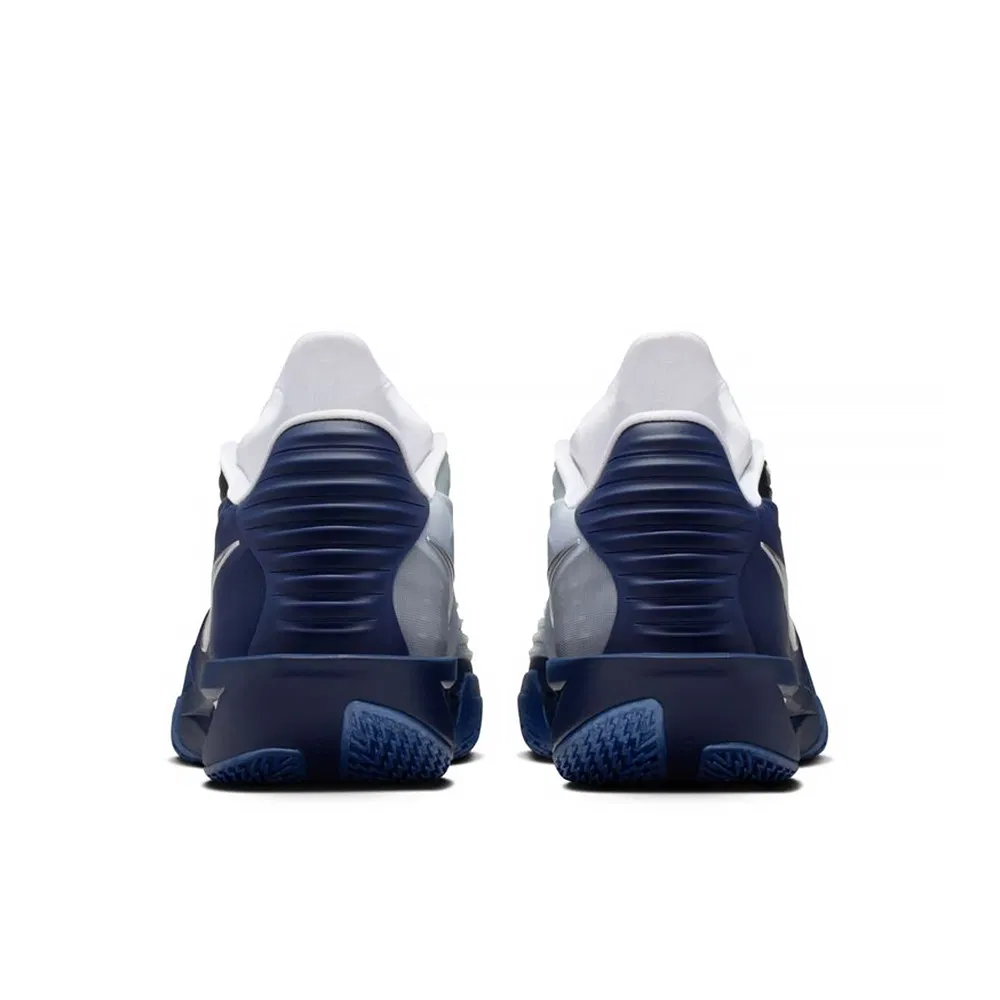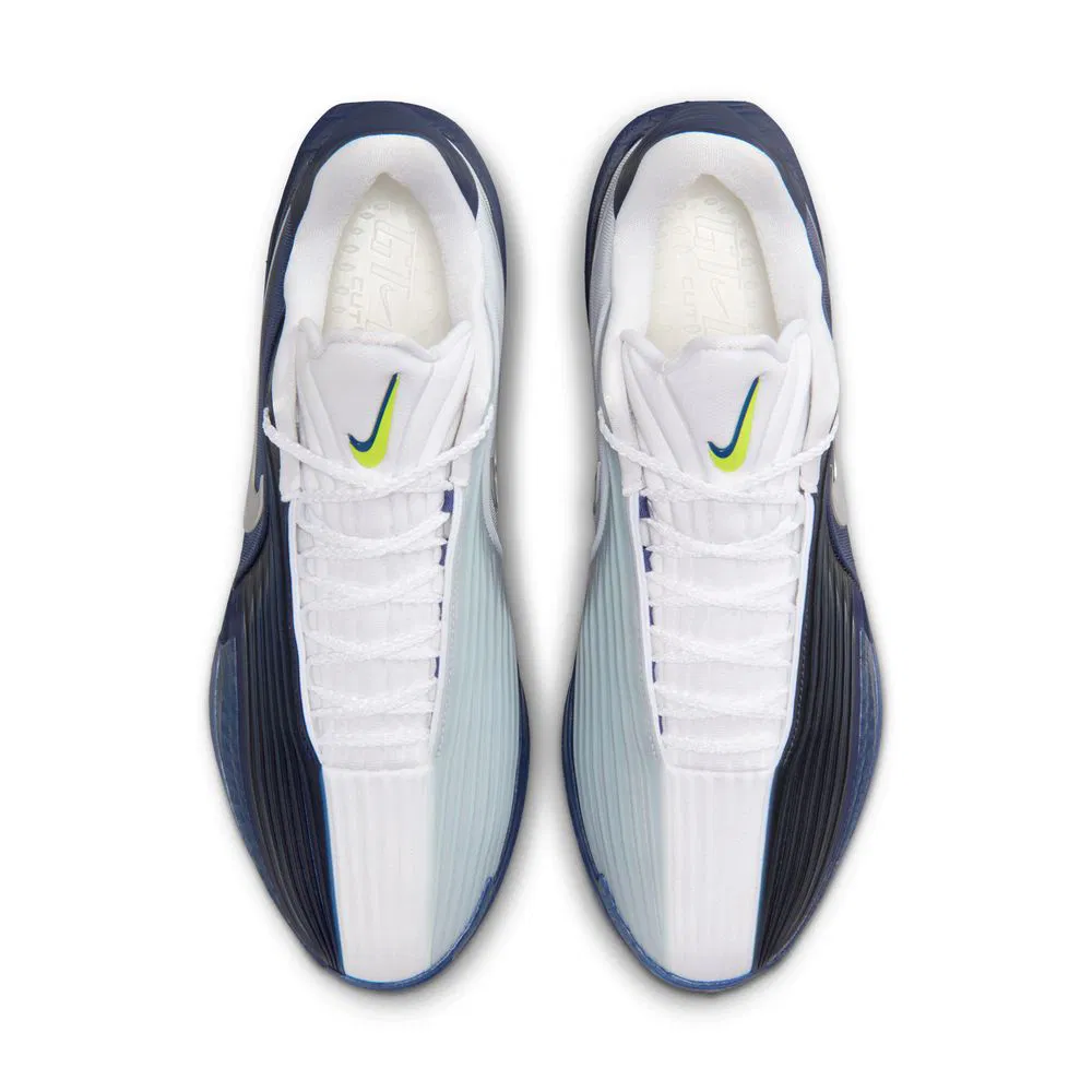Le modèle innove cette fois en prenant les couleurs d’une franchise NBA, celle des Dallas Mavericks en l’occurrence. La tige est scindée en trois, avec des parties latérales bleu marine et grise accompagnée de blanc sur le milieu de l’avant du pied et la languette, sur laquelle un « Swoosh » ressort en vert fluo.