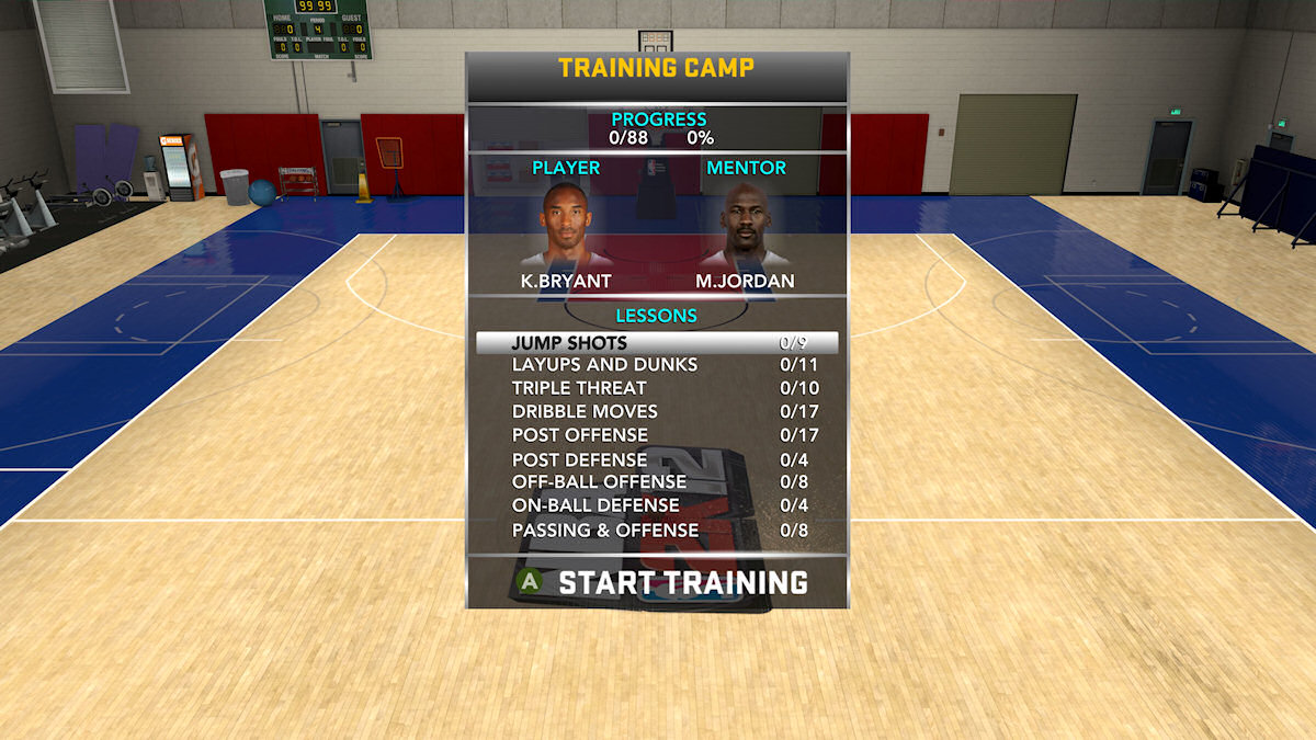 Par exemple, pour la leçon sur les tirs en suspension, Kobe Bryant s’entraînera avec Michael Jordan. Autrement dit, vous contrôlerez Kobe pendant l’entraînement. Au fur et à mesure de votre progression dans le camp d’entraînement, de nouveaux tandems de joueurs/mentors apparaîtront. Dwight Howard et Hakeem Olajuwon en font partie.