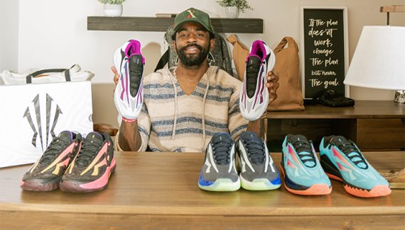 Le second s’inspire des mouvements élégants de Kyrie Irving sur le terrain, où chaque changement de direction et chaque accélération évoquent un papillon virevoltant. La palette présente un thème blanc et violet, avec le logo mis en valeur par un dégradé de violet.
