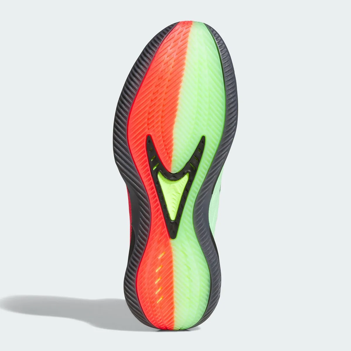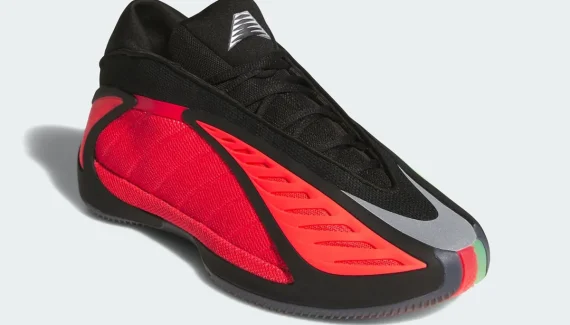 La base en vert clair sur le côté gauche et rouge sur le côté droit fait ressortir l’esprit de Noël. La tige est complétée par une partie supérieure en noir, des zones en TPU, une touche de gris métal à l’avant, de la même couleur que le logo du joueur sur la languette, et les trois bandes sur le talon.