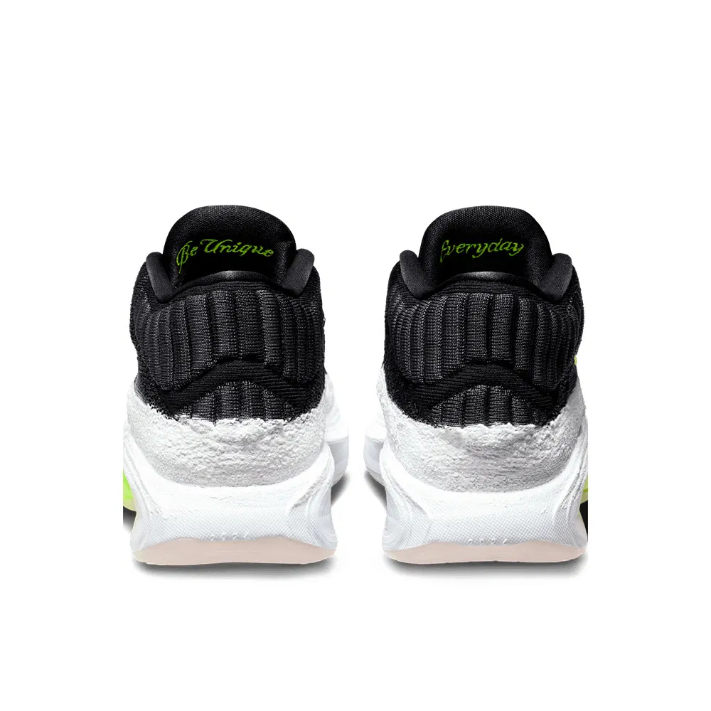 La tige se compose d’une base d’un blanc neigeux, complétée par une partie supérieure en noir. Des finitions en rouge et vert fluo complètent l’ensemble, notamment pour faire ressortir le « Swoosh » latéral. Le slogan « Be Unique Every Day » apparaît cette fois à l’intérieur de la languette, laissant place à une pastille également saupoudrée de blanc sur la partie extérieure.
