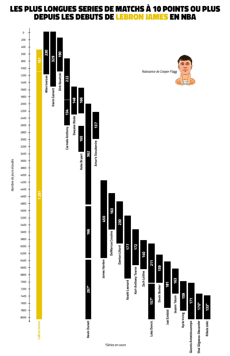 Dans ce laps de temps, la deuxième meilleure série du genre sera pour Kevin Durant, avec 562 matchs. Bien sûr, cette série est à un moment donné clairement devenue un objectif à part entière, surtout lorsque le record de Michael Jordan (866) était à portée, même si LeBron James s’est toujours défendu de tout faire pour la prolonger…