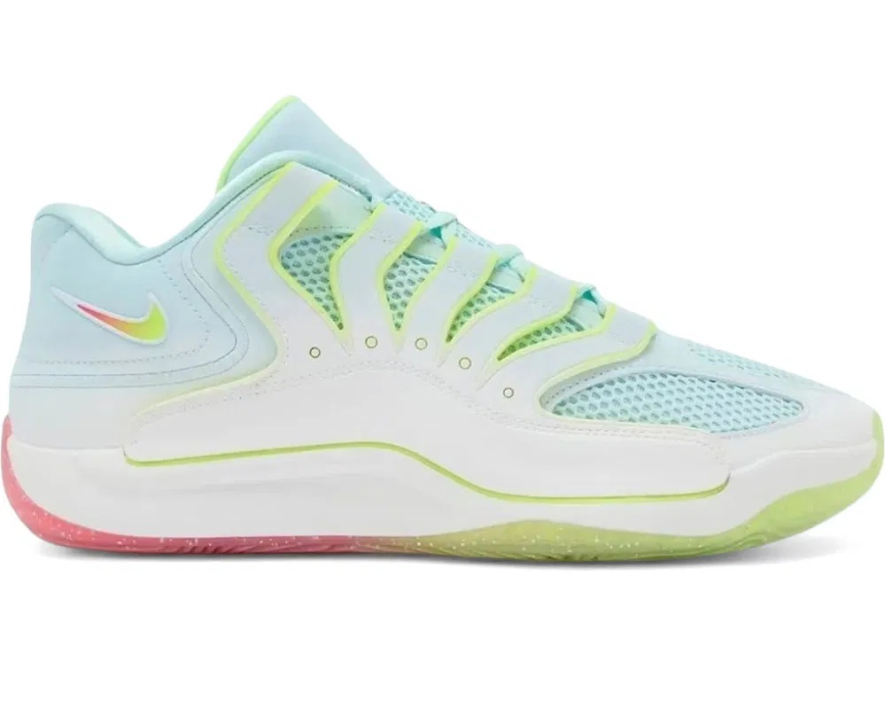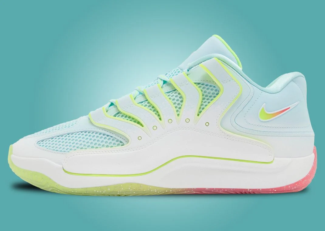 Nike va encore sortir une belle collection pour Noël et la KD 18 est bel et bien sur la liste. La 18e chaussure signature de Kevin Durant innove elle aussi en laissant les coloris traditionnels de côté et en optant pour une version plutôt… « fraîche », avec une base d’un bleu glace assorti à un blanc éclatant.