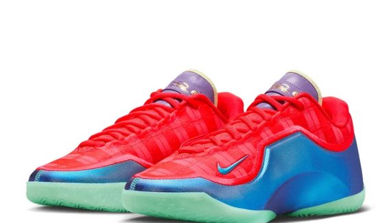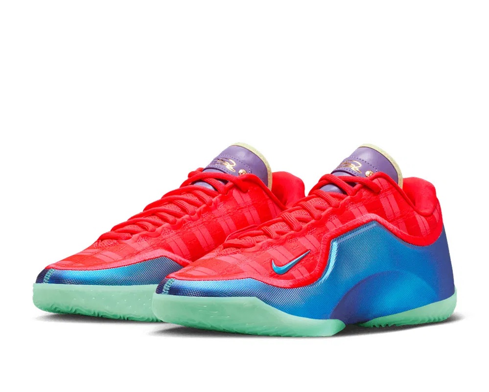 Un palmarès qui valait bien une LeBron 23 au coloris « Stocking Stuffer » pour marquer le coup, avec une tige entre bleu-vert et rouge et une languette en violet et beige, sur laquelle sa signature ressort en doré. La semelle extérieure en caoutchouc complète l’ensemble d’un vert clair. Le détail qui tue se situe au niveau du talon où figurent un « L » et un « J » en forme de chaussettes rouge et blanche.