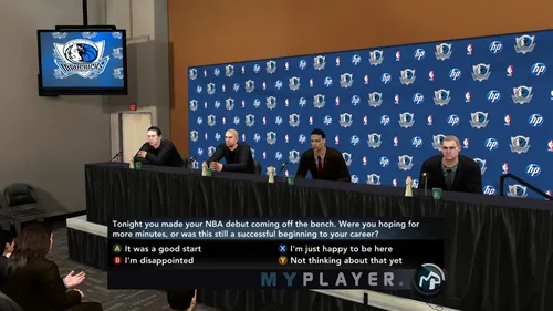 Les conférences de presse ont fait leur apparition dans NBA 2K11, et elles ont été bien accueillies.Résultat, 2K Sports introduit quatre fois plus de questions que l'année dernière. Ainsi, vous pourrez répondre à BEAUCOUP plus de questions de la part des journalistes au sujet d'événements spécifiques. Il y aura très peu de questions générales, on vous interrogera sur des sujets plus précis liés au match que vous venez de jouer, sur l'état d'esprit de l'équipe et concernant votre opinion à propos… de tous les sujets possibles.