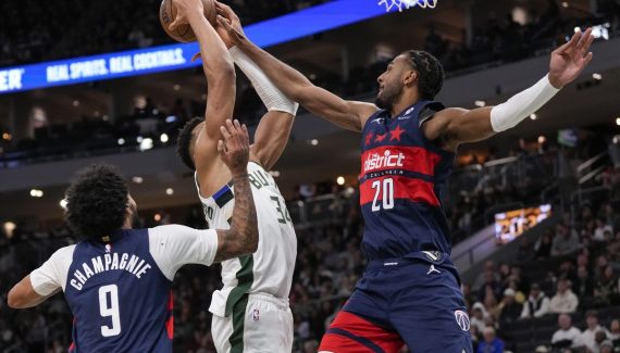 Kevin Porter Jr. tente d’être le héros des siens en s’enfonçant dans la raquette des Wizards, mais son layup est trop compliqué, sauf que Giannis Antetokounmpo surgit pour prendre le rebond offensif. Il a ainsi l’occasion d’offrir cinq points d’avance à son équipe sous le cercle, mais Alex Sarr surgit encore pour le contrer ! CJ McCollum peut alors partir en contre-attaque et inscrire le tir de la gagne pour Washington, qui s’impose 114-113.