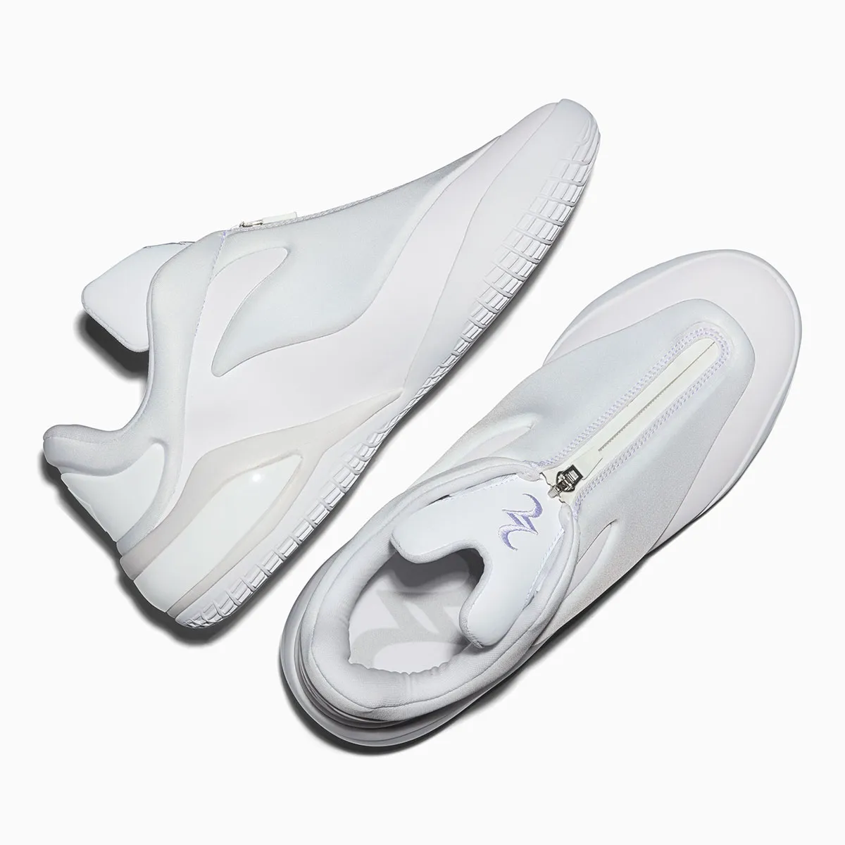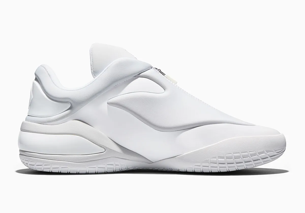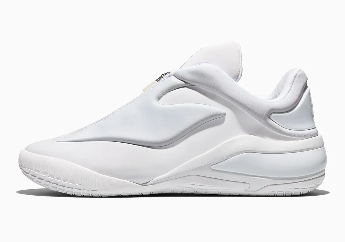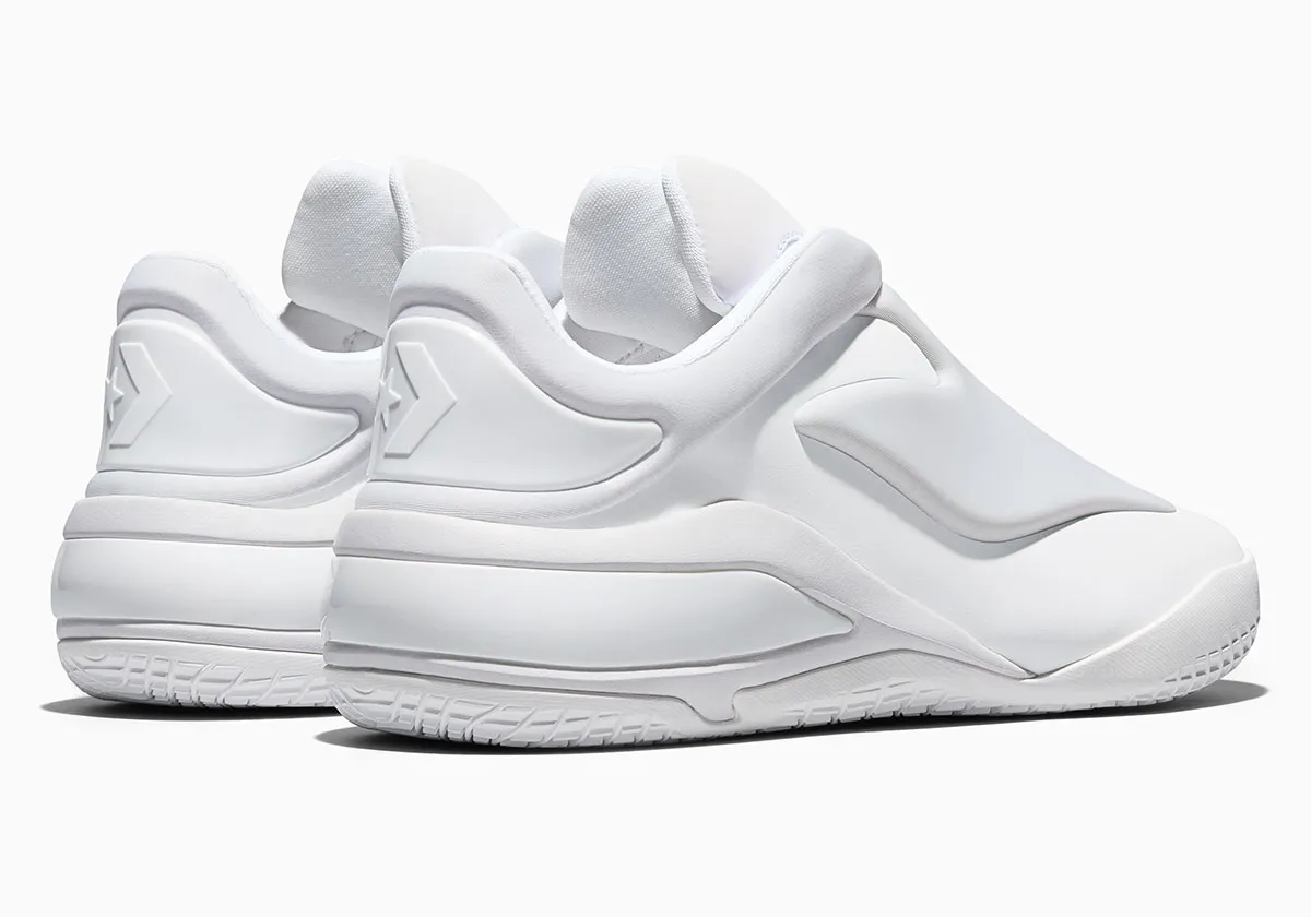 Ce nouveau coloris se présente donc avec une tige et une semelle entièrement en blanc. On distingue tout de même le logo du joueur, brodé sur la languette, et les contours du logo Converse sur le talon.