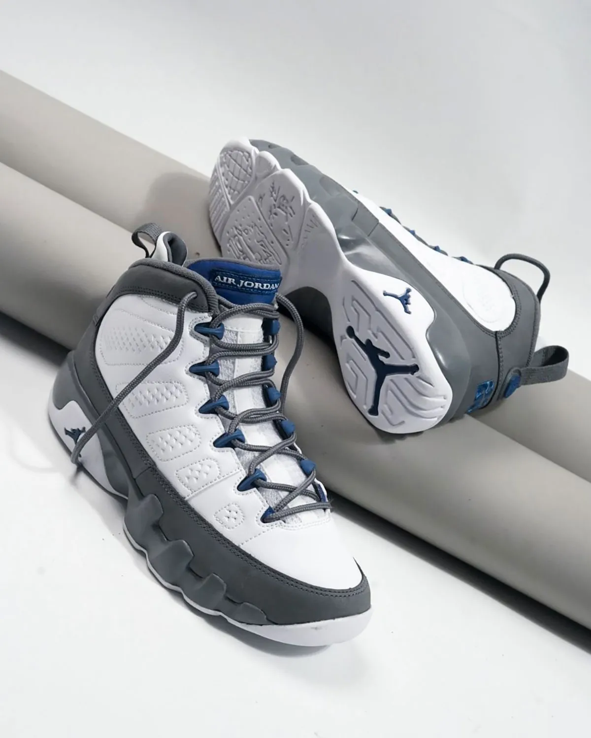 Le coloris sorti en 2002 devrait encore faire mouche en 2026 avec une tige formée d’une structure en cuir blanc et de superpositions de daim gris en renfort à sa base et remontant jusqu’au col en passant par le talon. L’ensemble est bonifié de quelques touches de bleu marine, pour faire ressortir le numéro 23 brodé de Michael Jordan sur le talon, les œillets, le haut de la languette sur lequel figure la mention « Air Jordan », ou encore le « Jumpman » incrusté au niveau de la semelle intermédiaire.