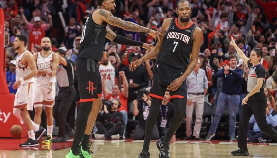 Kevin Durant avait clairement un message à faire passer aux Suns. Il reste 5,1 secondes à jouer entre Houston et Phoenix, les deux équipes sont à égalité, 97-97. « KD » obtient le ballon suite à une remise en jeu. De deux dribbles sur sa droite, il se décale face à Royce O’Neale, avec Devin Booker non loin. Il s’élève à 3-points et fend le cercle avant de célébrer d’un sourire narquois et d’un geste semblant signifier : ‘Dites-leur de rentrer chez eux’. Les Rockets se sont imposés grâce à leur star, tout spécialement motivée par cette affiche contre son ancienne équipe.