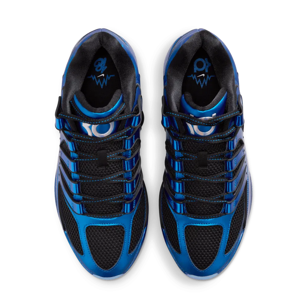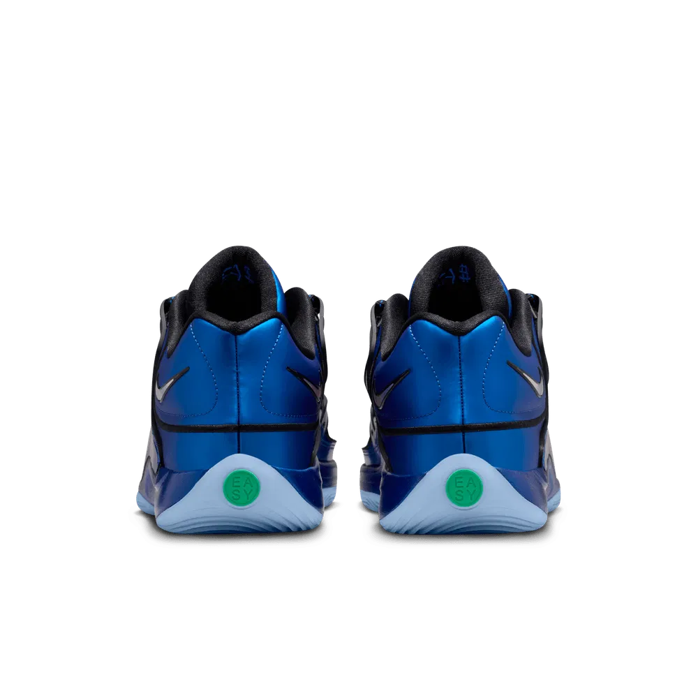 La tige est habillée d’un magnifique bleu métallique, accompagnée de touches de noir et de finitions en gris métal, sur le logo « KD » toujours présent sur la languette et le petit « Swoosh » au niveau de la malléole. Le patch « Easy » apparaît ici en vert à la base du talon.