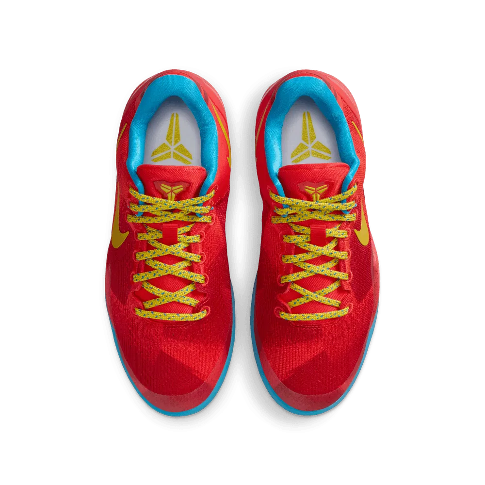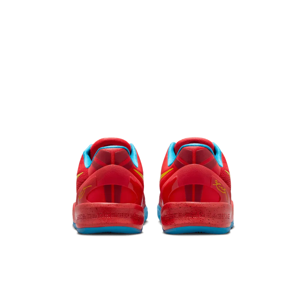 Le « Black Mamba » va donc passer du serpent au cheval avec une tige qui se présente en différentes teintes de rouge et aux finitions dorées, pour faire ressortir le « Swoosh », les lacets, et la signature du joueur. L’ensemble est complété par du bleu pour habiller la semelle et l’intérieur du col.