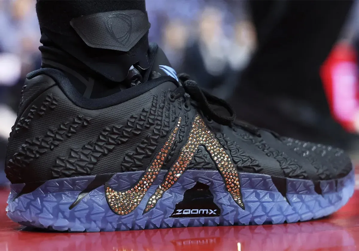 Pour la troisième année de suite, la chaussure signature de Ja Morant et la marque de luxe Swarovski ont poursuivi leur collaboration pour concevoir une Nike Ja 3 exposée au monde entier hier. Le modèle en envoie (encore) plein les yeux avec sa tige noire délaissant l’assemblage mesh et TPU pour du 100% cuir, une semelle extérieure teintée de bleu translucide et des pierres Swarovski sur le motif JA présent sur un côté de chaque chaussure.