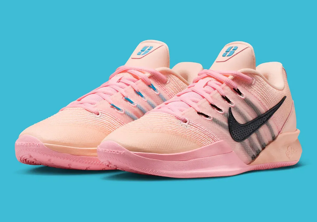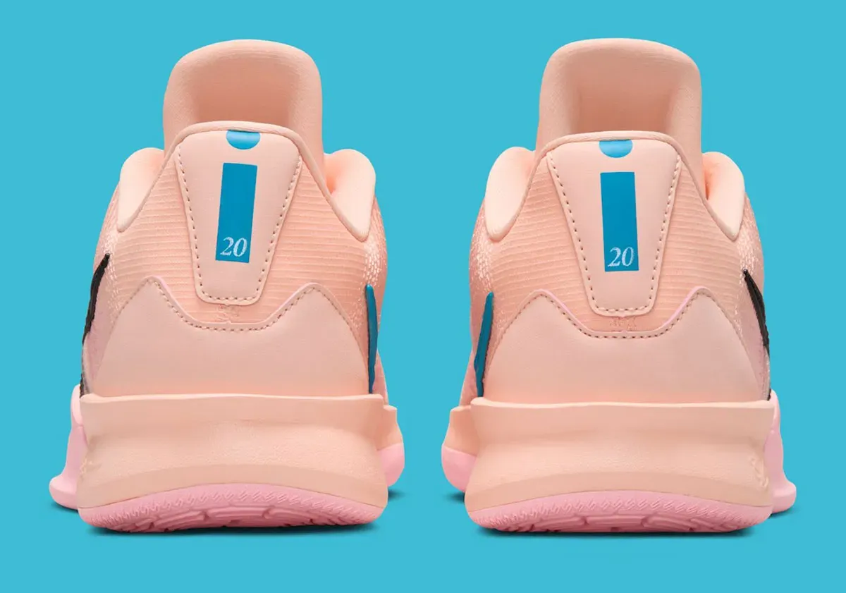 Proche de la Sabrina 3 « Three », la tige est habillée de nuance de rose-saumon, et se distingue avec des finitions en bleu d’un côté, sur les câbles FlyWire et le « Swoosh », et en noir de l’autre. Le logo « S » de la joueuse sur la languette apparaît en bleu, tout comme la languette sur la talon, où l’on retrouve son numéro 20.