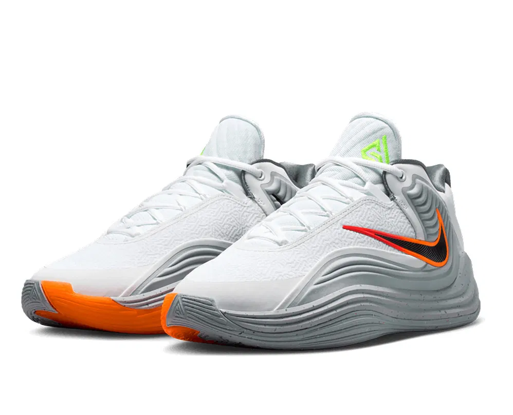 Pendant que les franchises intéressées s’activent déjà pour essayer de le récupérer en coulisses, Nike se tient prêt à remettre la superstar NBA en haut de l’affiche. L’opération a déjà commencé avec la sortie de ce nouveau coloris « Cement » pour habiller la Giannis Freak 7. La tige oscillant entre blanc et gris est complétée par des finitions en orange et vert fluo. Le logo du joueur apparaît ainsi en vert fluo sur la languette tandis que le « Swoosh » latéral, inversé, ressort en noir et orange. On retrouve également une partie en orange sur la semelle extérieure, sur laquelle les motifs permettent de lire le nom de famille du joueur.