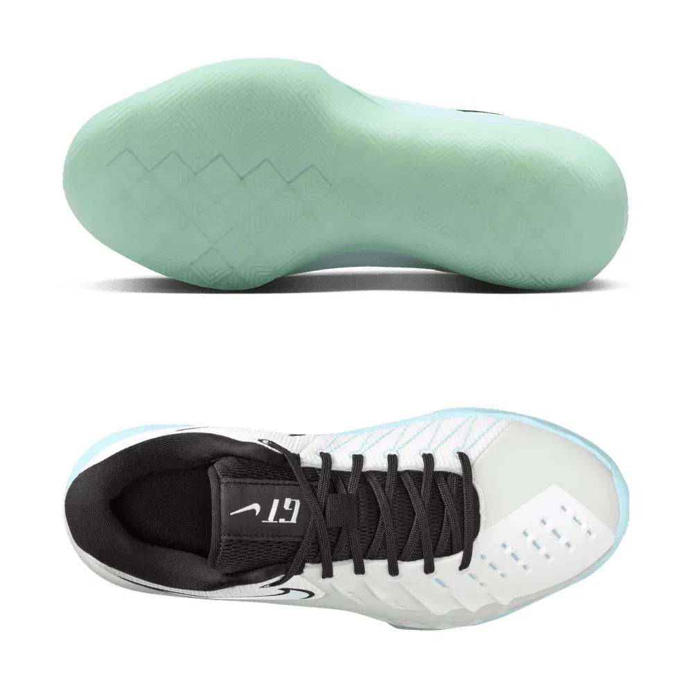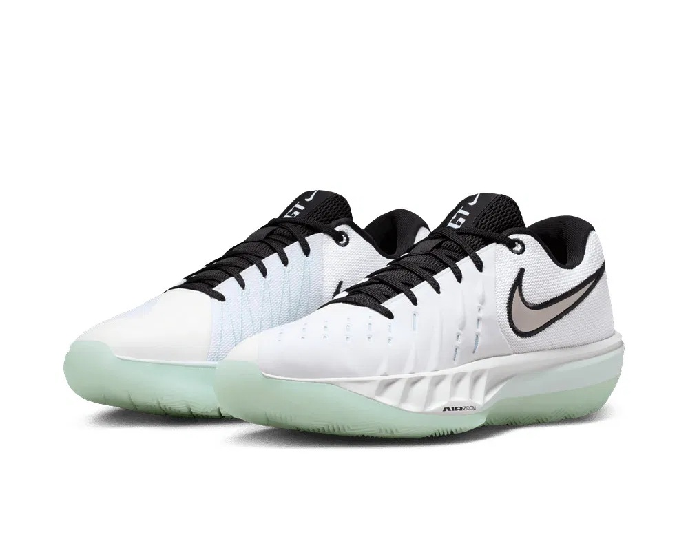 Le premier coloris « Blue Glacier » de cette Nike GT Cut Academy 2 opte pour du classique avec une tige blanche, un « Swoosh » en noir et gris et un assortiment col-languette en noir, l’ensemble reposant sur une semelle extérieure en caoutchouc bleu glace translucide. La mention « GT », pour « Greater Than », apparaît sur la languette et sur le talon.