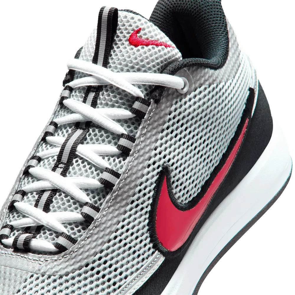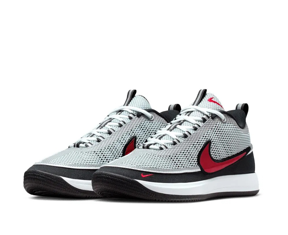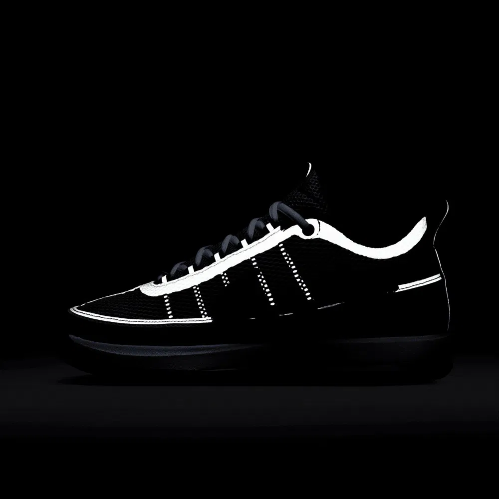 On retrouve ainsi cette tige mêlée de gris, blanc et noir. Les trois « Swoosh » ressortent en rouge, sur la languette, l’empeigne et l’avant du pied. La mention « Chapter Two » à la verticale sur le talon apparaît également en rouge sur fond gris. L’ensemble repose sur une semelle blanche et noir, composée au niveau intermédiaire d’une mousse du nouveau Cushlon développé par Nike, assortie d’une unité Air Zoom sur toute la longueur. Petit plus, la paire brille dans l’obscurité !