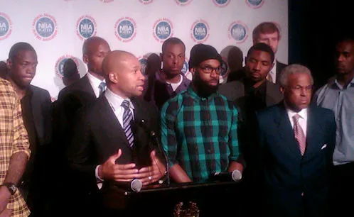 Puis, à 1h00 (heure française), après cinq heures de réunion, on a demandé à tous les journalistes de se réunir pour écouter Derek Fisher. Les joueurs étaient plutôt détendus (LeBron et Pierce notamment) derrière leur président qui s'est ensuite exprimé.