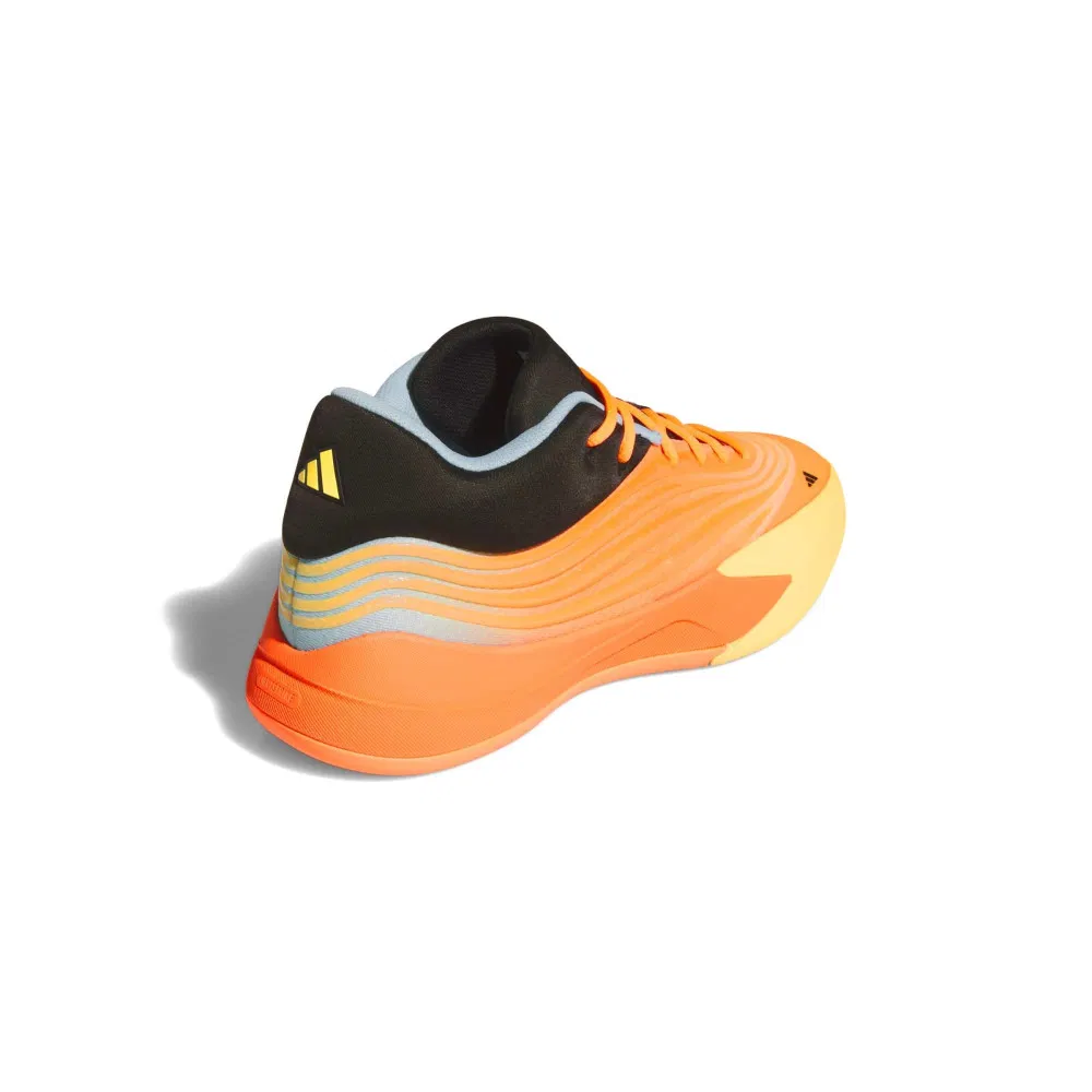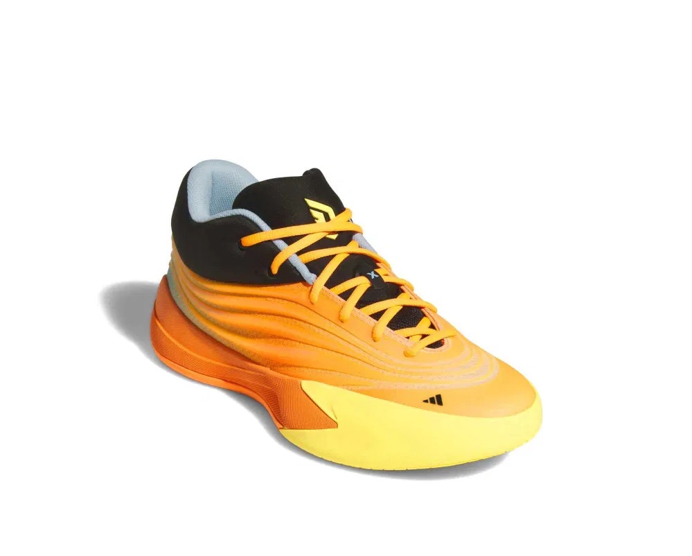 La tige ressort en orange, complétée par un col en noir et une partie avant en jaune. Le logo du joueur et les trois bandes d’adidas apparaissent en jaune sur fond noir, respectivement sur la languette et le talon.